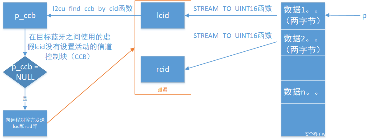STREAM_TO_UINT16宏而不检查攻击者控制的数据包中是否剩余了足够的数据。如果第二次使用STREAM_TO_UINT16时,数据包中没有剩余字节,那么将越界读取rcid结果:泄漏数据包后相邻的两个字节(rcid)