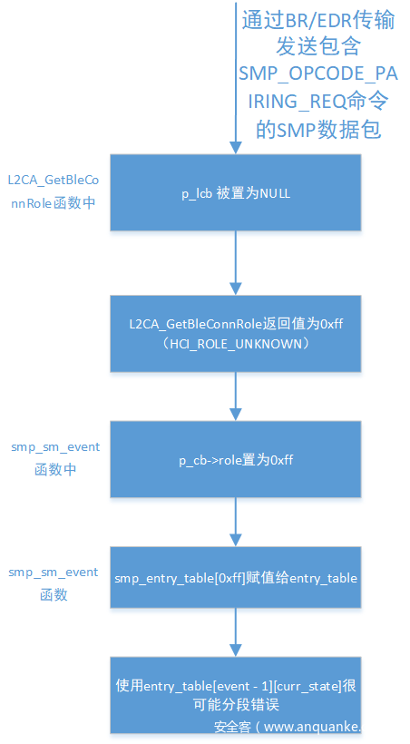 在957行,代码使用p_cb-> role作为索引从smp_entry_table静态数组中读取,而无需检查p_cb-> role是否具有两个有效值之一(HCI_ROLE_MASTER(0x00)或HCI_ROLE_SLAVE(0x01))。这就是漏洞所在:smp_entry_table静态数组仅包含2个元素,而p_cb-> role的值为0xFF,是在通过BR / EDR传输接收到包含SMP_OPCODE_PAIRING_REQ命令的SMP数据包之后,而不是通过预期的低能耗传输: