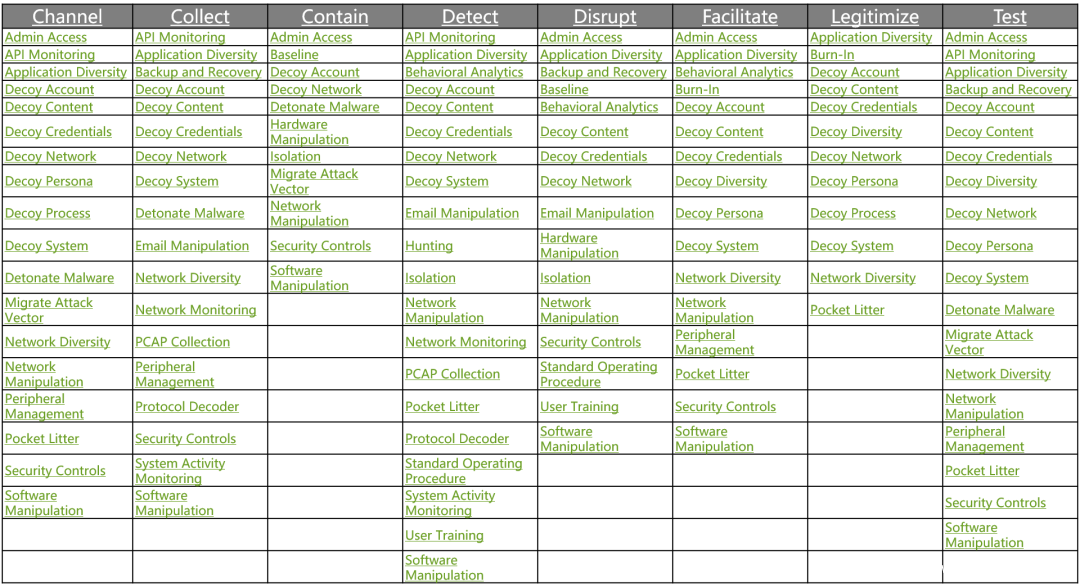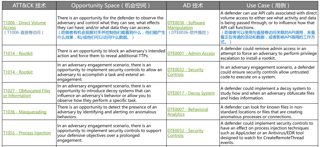 - 机会空间(Opportunity Spaces):描述当攻击者运用他们的技术时引入的高级别积极防御可能性。