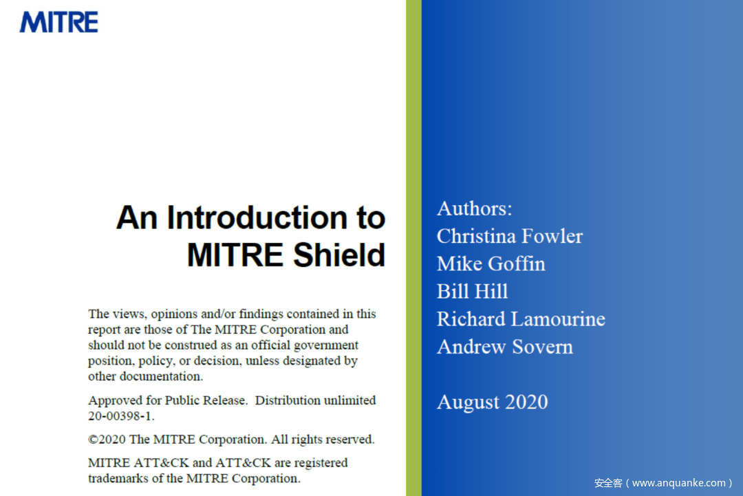 Shield积极防御知识库由MITRE的交战团队(engagement team)于2019年创建,用于改进作战行动计划。2020年8月,MITRE发布了《MITRE Shield 介绍》,封面如下: