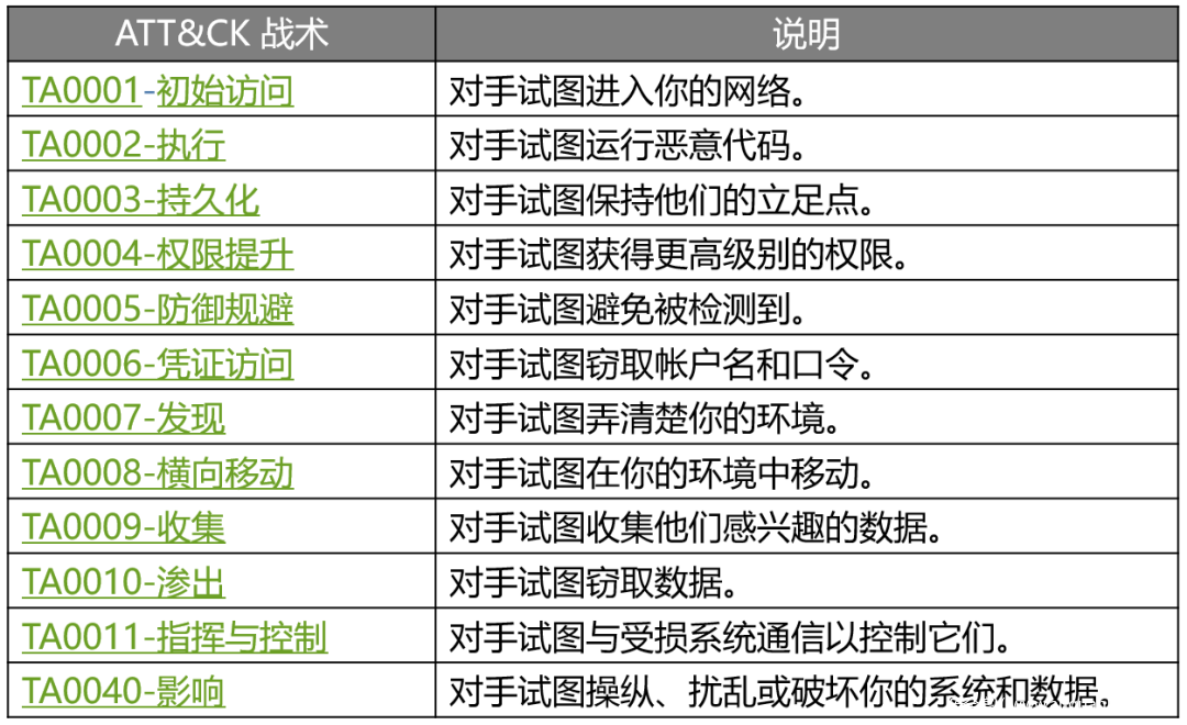 - ATT&CK技术:该战术所使用的对手技术,包含ATT&CK技术的ID和名称;
