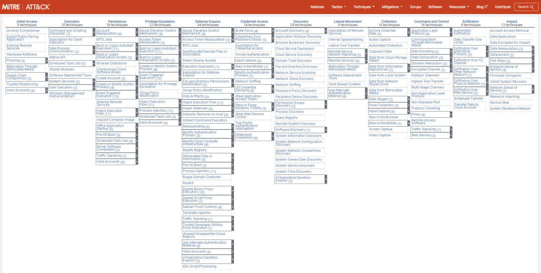 通过对比上表与下图(ATT&CK 矩阵)的第一行列标题可知,上面列出的12项ATT&CK战术与ATT&CK矩阵是严格对应的。
