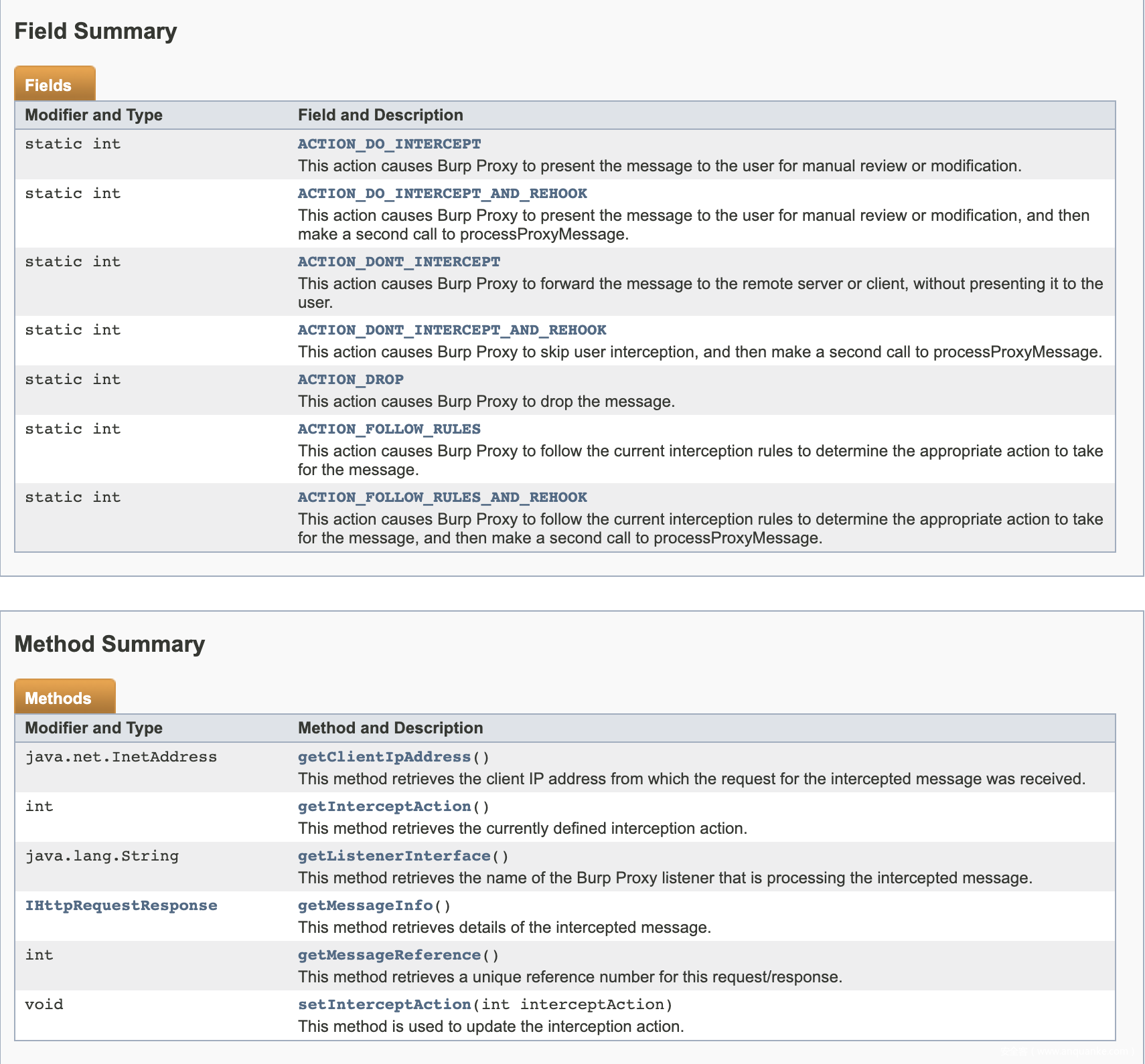 此接口提供了很多的方法和字段,在此不一一列举,具体的说明可以在 burp SDK 中的 IBurpExtenderCallbacks.java 或 https://portswigger.net/burp/extender/api/burp/IBurpExtenderCallbacks.html 中查看。