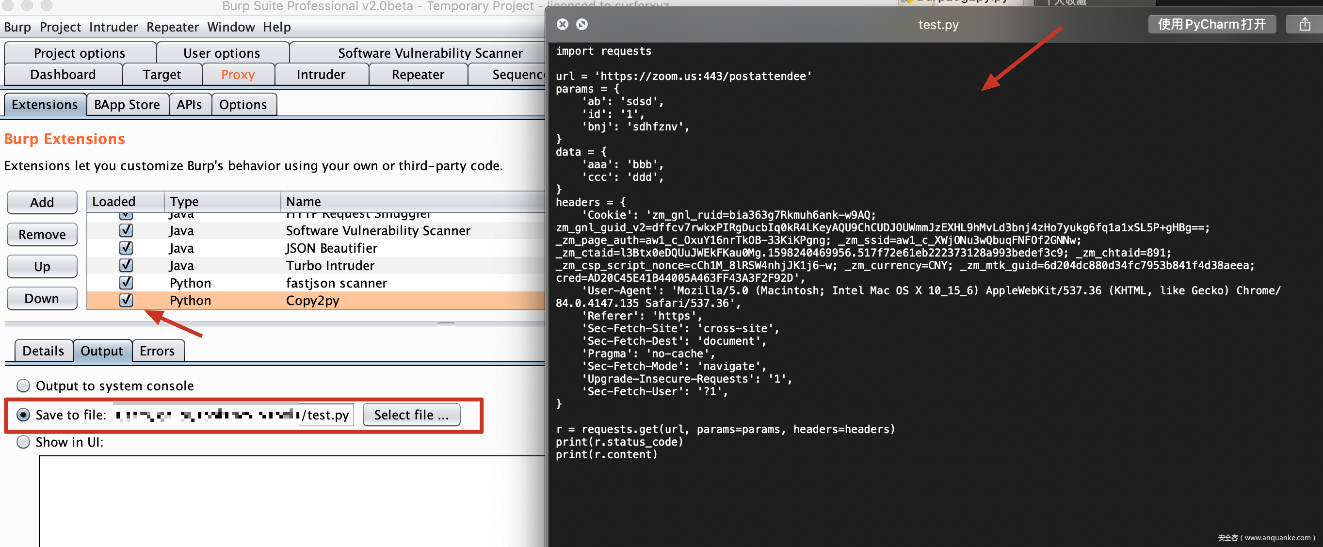 由于burp本身没有提供写文件的接口,只有保存成临时文件的saveToTempFile, 所以这里采用重定向插件输出到file的方式实现copy to py.