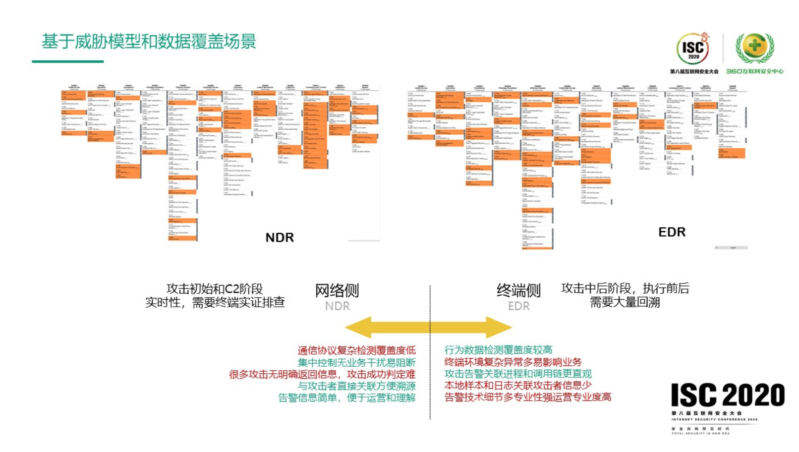 在实践中,发挥威胁运营价值很重要的数据包括网络侧NDR和终端侧EDR的数据,网络侧的数据会集中在攻击的初始阶段或者命令控制阶段,有比较高的实时性,能够比较好的实现溯源追踪,但是很难实现实锤,需要终端去做一些实证排查。另外一块是终端侧的数据,会集中在攻击的中后阶段,例如样本或者命令执行的前后阶段,往往是比较碎片化的,需要进行大量的回溯才能还原整个攻击事件。基于ATT&CK矩阵工具的对NDR和EDR覆盖矩阵点的分析结果可以看出,两侧数据的覆盖面是互补的,都无法完全覆盖所有攻击战术和手法,结合起来才能够看的更全面。