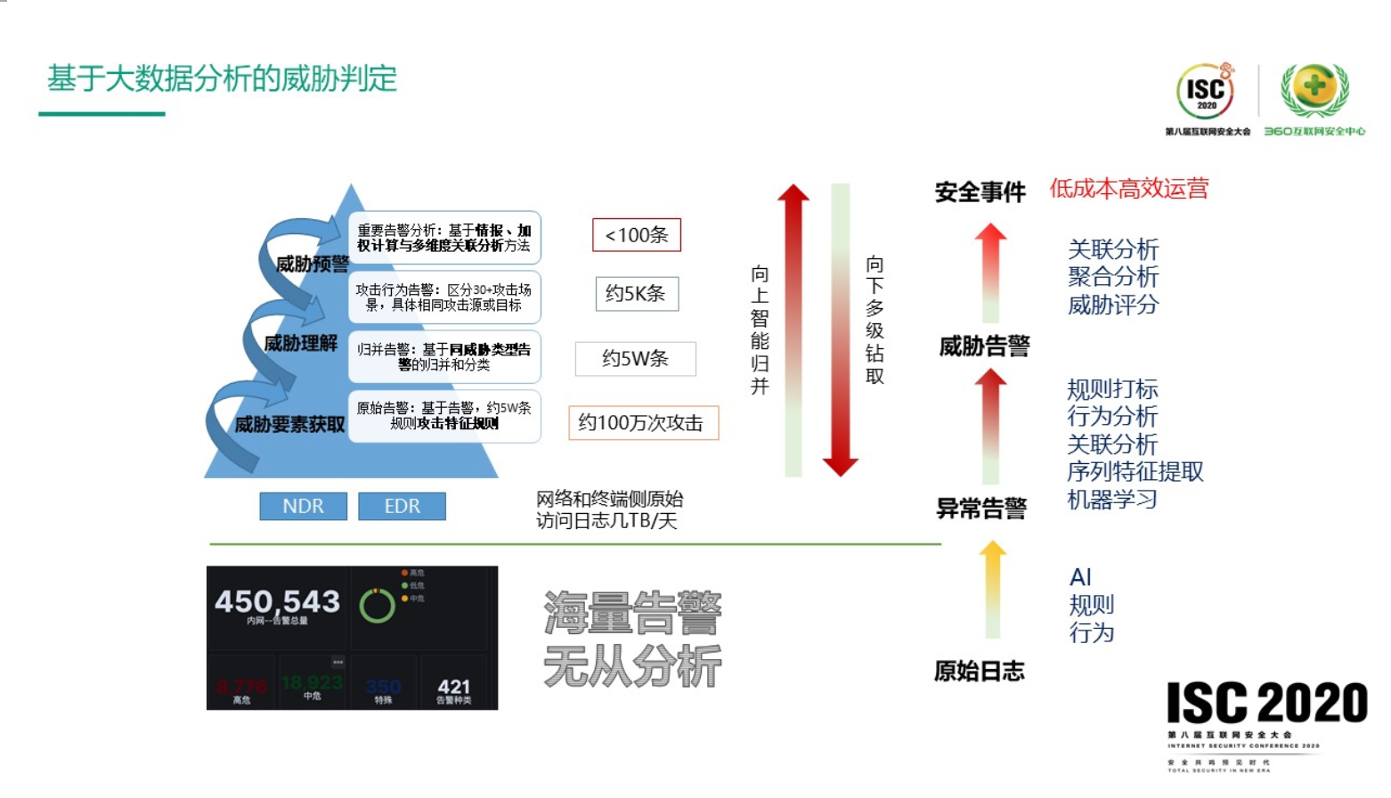 电影里的“照片墙”可以非常形象的表达在威胁运营的中面对的问题,首先是威胁运营的分析人员,在海量数据里往往看到的并不是威胁的全貌,能看到是单一的攻击线索,非常碎片化的信息,如何把这些海量的数据中碎片化的信息,通过线索关联起来,去定位攻击者或者受害者,然后找到攻击的手法和工具,这就是整体做威胁运营分析的最重要的思路。具体落地到威胁运营的数据上来看,一般来讲从海量的原始数据到最终的安全事件,是一个逐渐收敛的过程,总结来说就是做到向上智能归并,向下多级的钻取。