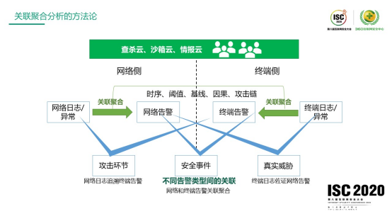 具体工程实现上网络侧和终端侧关联的思路,一般会把两侧的原始告警通过关联聚合的方法形成各自的网络告警和终端告警,具体包括时序、因果、阈值统计、基线、因果、跨攻击链的方法等。这些关联形成的网络告警或者终端告警已经是比较准确的,如果再能关联上,就是比较实证的安全事件;网络侧原始数据跟终端告警关联能够快速实现终端告警的追溯,网络侧告警跟终端侧原始日志关联起来,能够实现网络侧告警的快速的佐证。