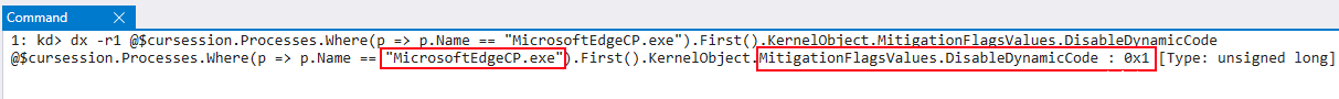 在引用EPROCESS成员MitigationFlagsValues时,我们可以看到DisableDynamicCode(即ACG)被设置为0x1,这表示该进程启用了ACG。