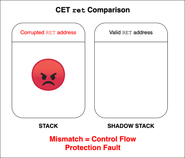 CET的主要论点是它对返回地址的保护,从根本上阻止了ROP。CET具有类似于RFG的方法,其中使用了shadow stack。