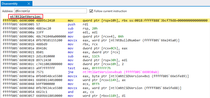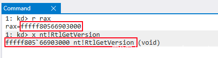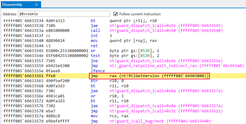 就在执行之前,kCFG bitmap接受RAX的值,它将是nt!RtlGetVersion而不是[nt!HalDispatchTable+0x8],以确定函数是否有效。
