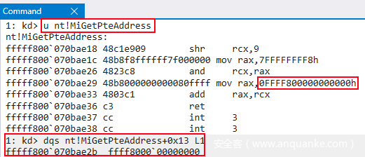 恢复指定虚拟地址的PTE的一种简单方法是取消PTE base的随机化。Windows API公开了一个名为nt!MiGetPteAddress的函数,Morten Schenk在2017年的BlackHat中提到已经在之前的漏洞利用研究中使用到。