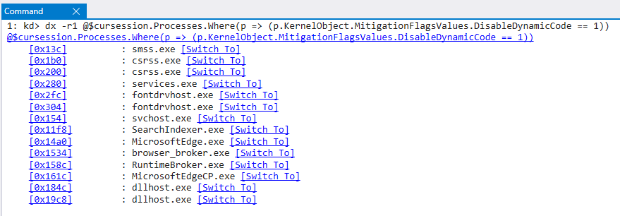此外,通过解析所有EPROCESS对象,可以获得启用ACG的所有运行进程的列表。