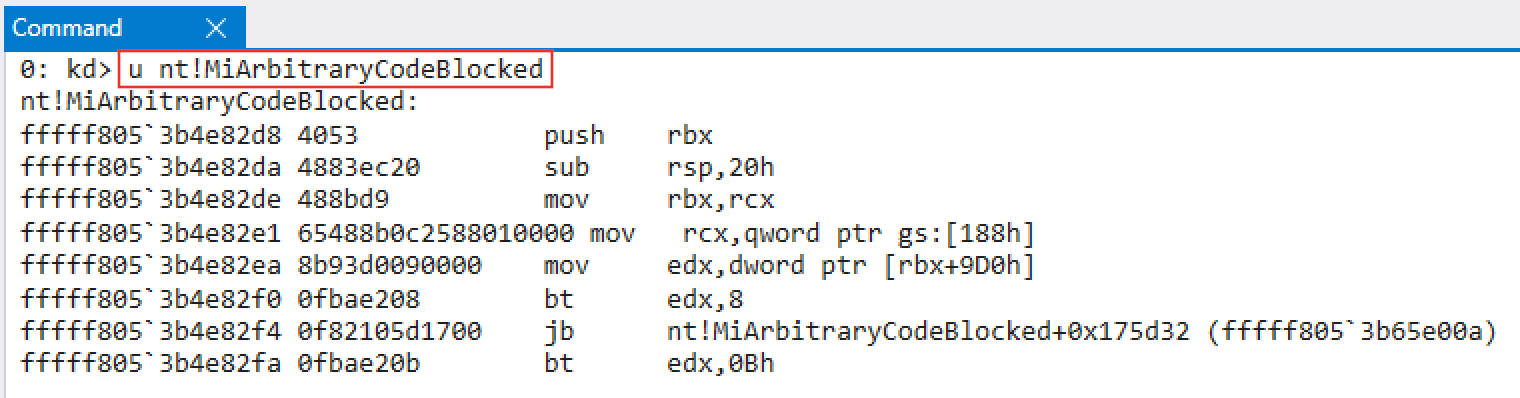 尽管ACG是一个用户模式缓解机制,但它是通过一个名为nt!MiArbitraryCodeBlocked的Windows API函数在内核中实现的。这个函数主要检查进程是否启用了ACG。