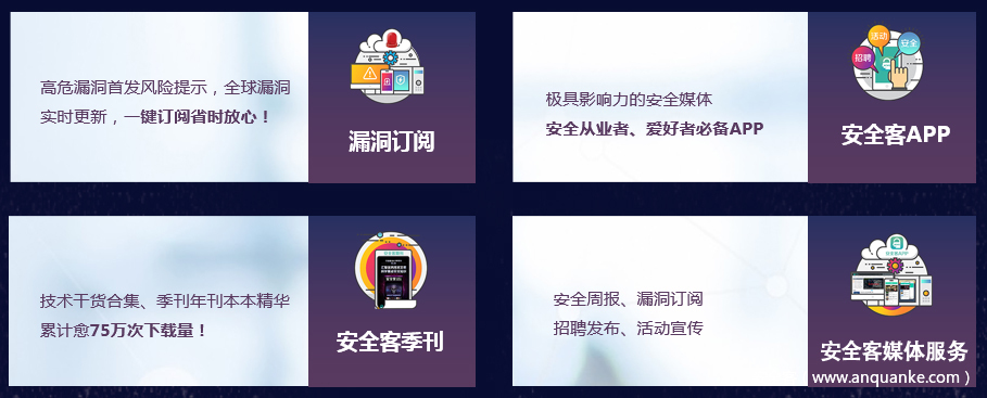 作为一个面向广大安全爱好者和从业人员的国内外安全资讯、安全知识及精彩的安全活动的一站式安全媒体平台,安全客致力于传播权威、即时、高质量的内容及活动。