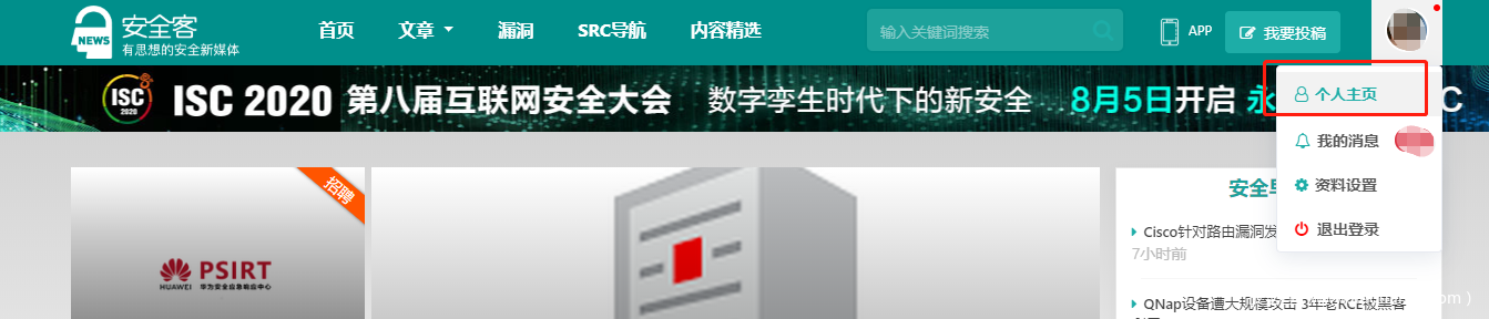 获取步骤示例:网页版登录安全客,点击右上角【个人主页 】
