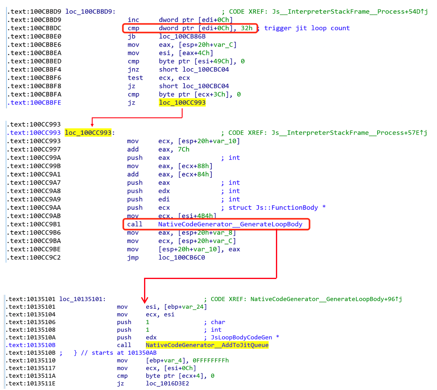 当循环计数大于某个阈值时(下图中的代码片段为0x32),循环体和内部调用函数opt将被发送到后端JIT引擎作业队列以生成优化的机器码: