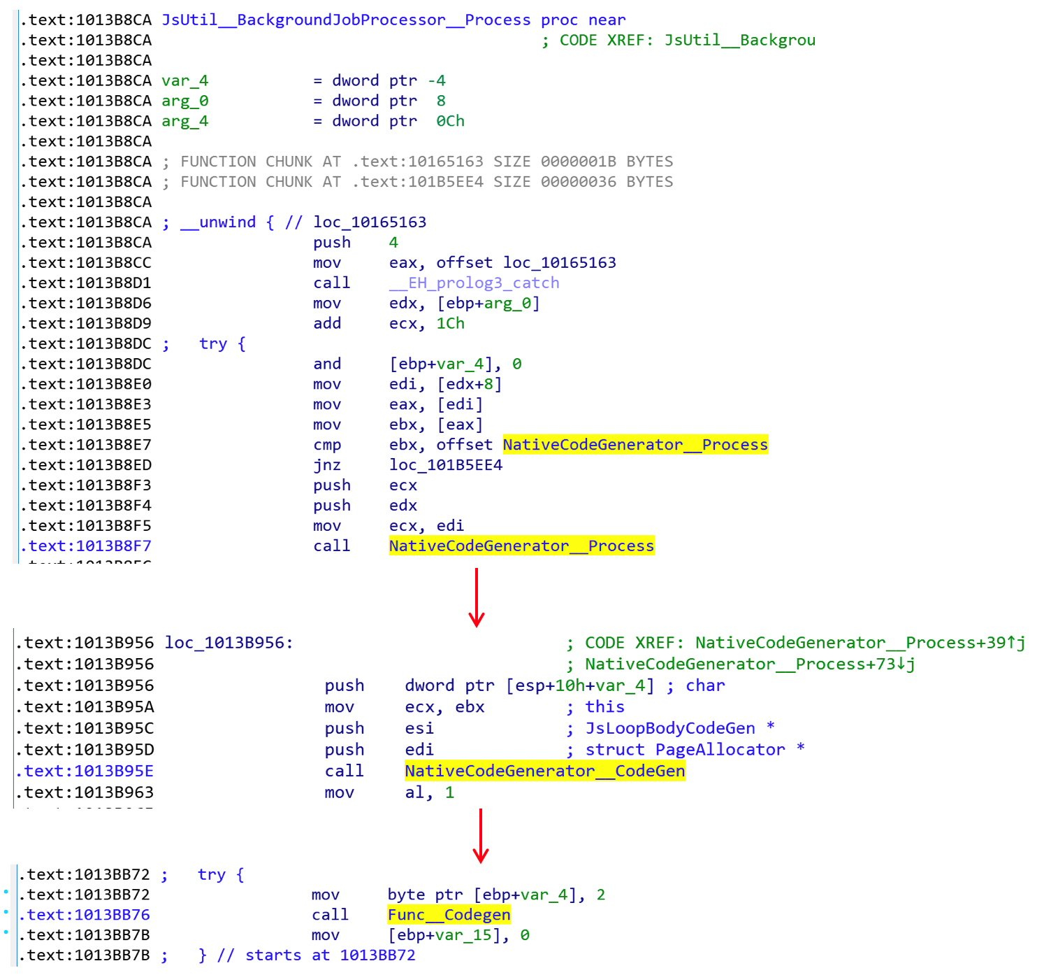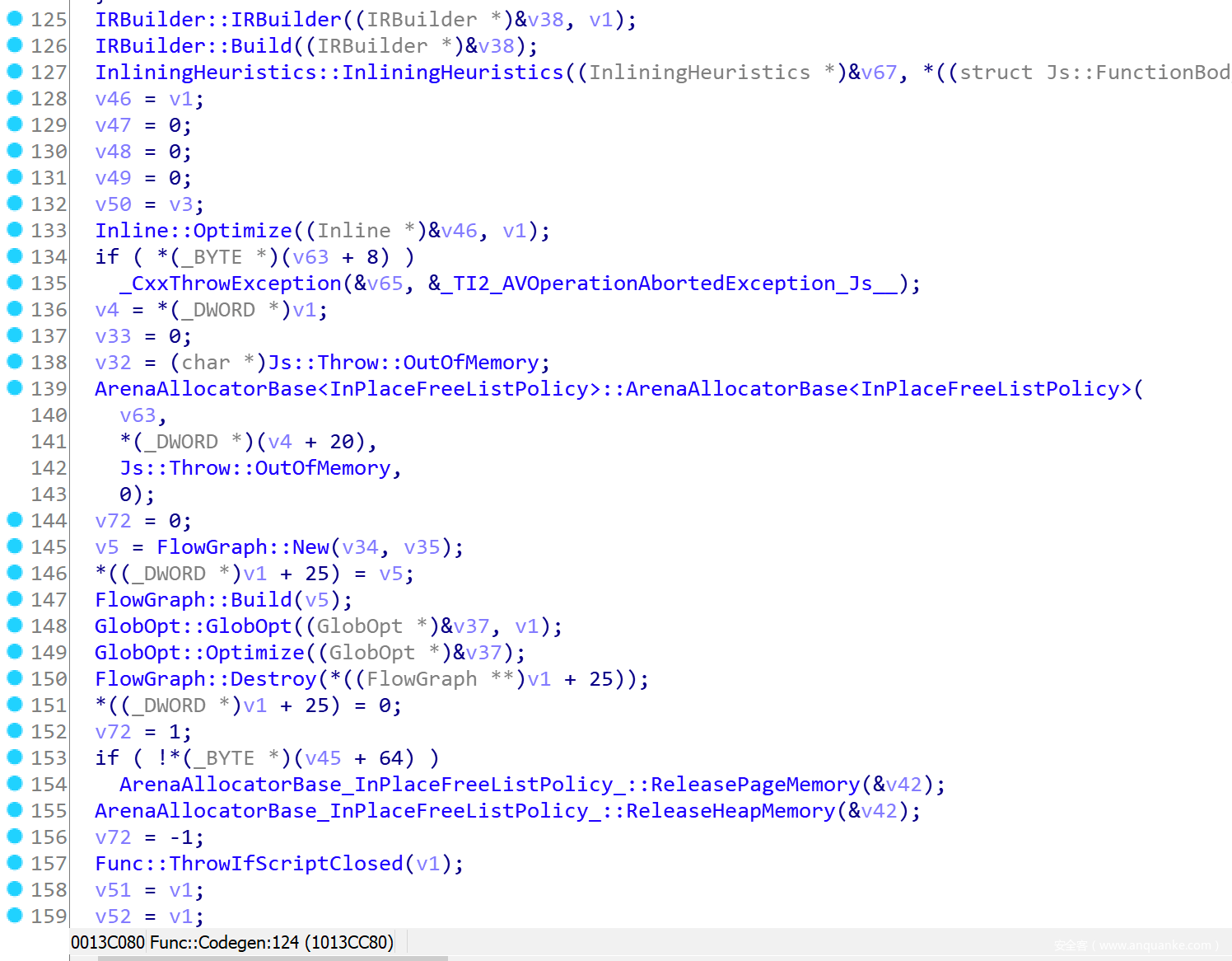 后端JIT引擎线程从队列中获取作业,最后调用jscript9!Func::Codegen生成优化的机器码: