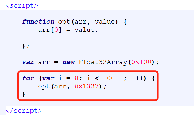 在介绍这个漏洞之前,我们首先需要定位到JIT引擎生成的机器码。for循环通常在解释器中调用JIT引擎。下图显示了一个可以触发JIT的JavaScript代码: