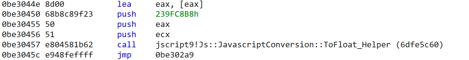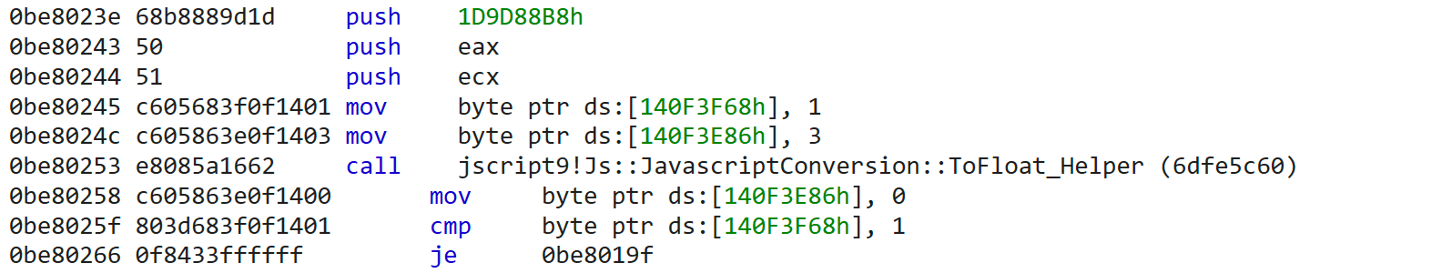 在调用类型转换函数jscript9!Js::JavascriptConversion::ToFloat_Helper 之前,将一些值分别设置为存储在地址0x140F3F68和0x140F3E86中的flag。存储在0x140F3F68中的flag是ImplicitCallFlags,存储在0x140F3E86中的另一个flag是DisableImplicitFlags。DisableImplicitFlags设置为3(DisableImplicitCallFlag | DisableImplicitExceptionFlag),这表示从要调用的JavaScript代码进行隐式调用时(例如valueOf),不允许将类型转换为float。