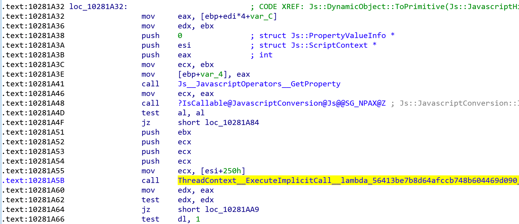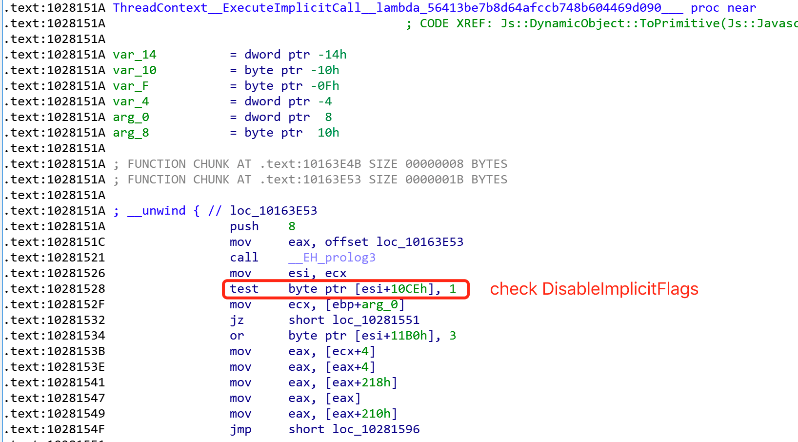 JavaScript是一种动态语言,类型或属性可以隐式转换。生成的机器代码在没有任何检查的情况下直接进行JavaScript隐式调用是不可信的。Jscript9.dll使用函数ExecuteImplicitCall来使JavaScript隐式调用安全。