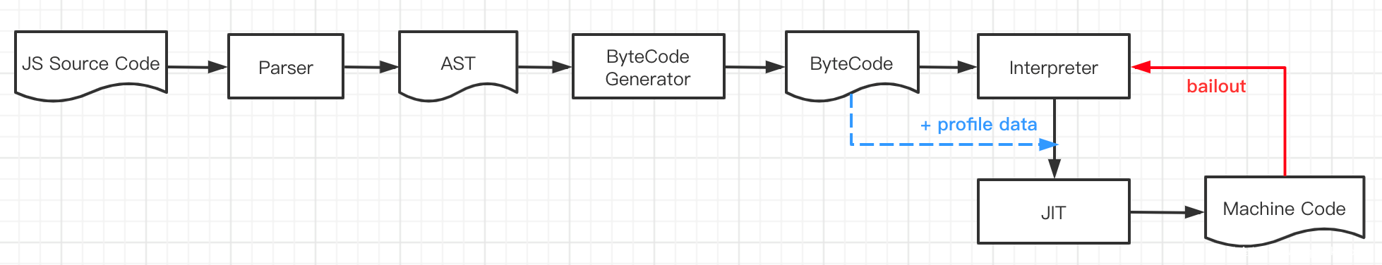 后端JIT引擎通过几个步骤来生成优化的机器码,如:构建IR(intermediate representation)、内联(inlining)、构建控制流图(CFG)、数据流分析、优化、分配寄存器、布局(layout)、编码等: