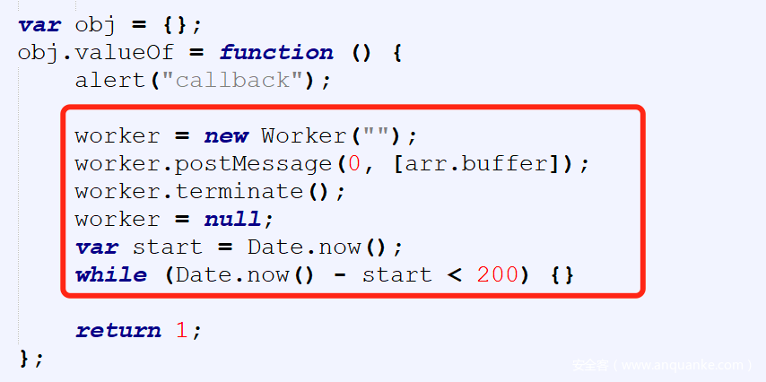 最后,将直接从机器代码中调用隐式调用valueOf。攻击者可以利用这个不检查回调的机会来触发UAF漏洞,例如通过Worker线程对TypedArray的ArrayBuffer内存进行过滤。