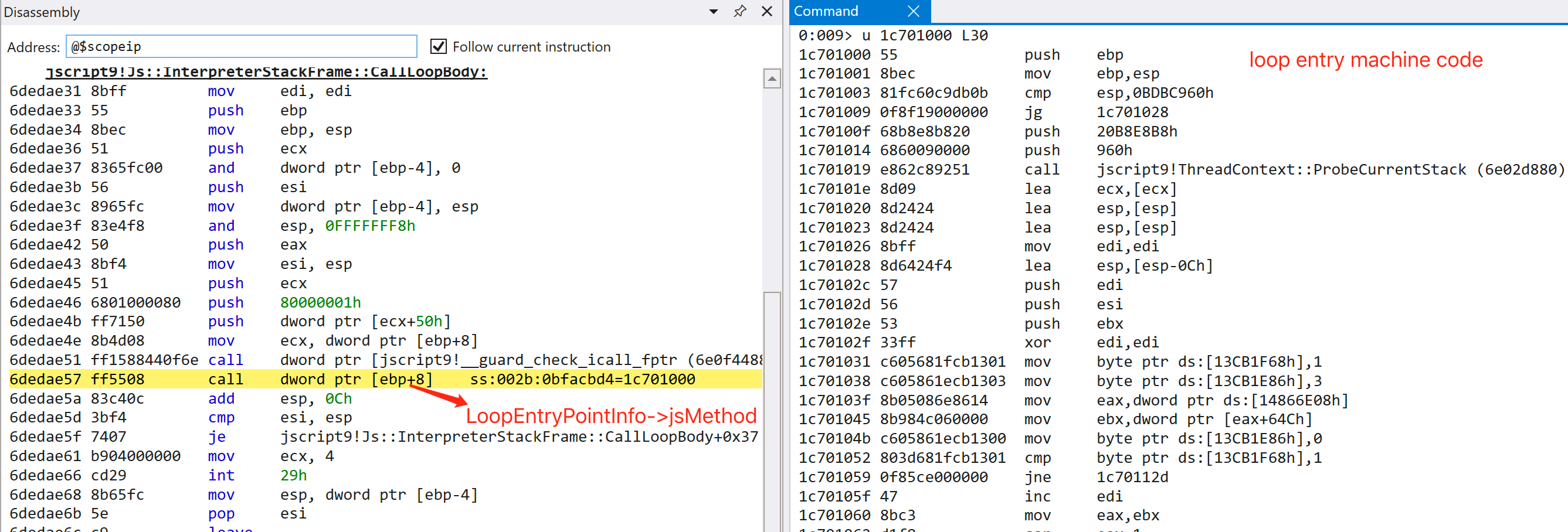 当生成优化的机器码时,它将用于替换字节码循环体。当接下来调用for循环时,将改为在函数Js::InterpreterStackFrame::CallLoopBody中调用机器代码: