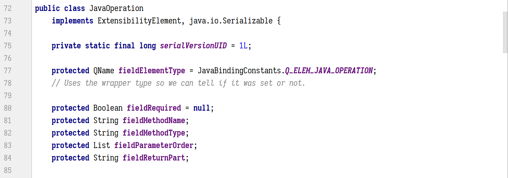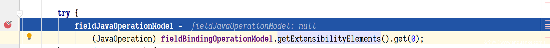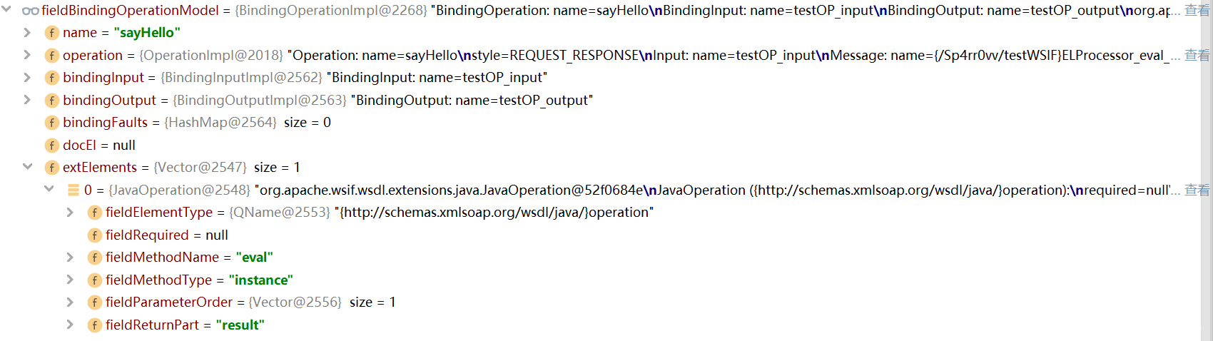接下来,是根据上面所说的,在实例化之前,筛选出的 wsdlbinding 中的那个 operation,将其中的 java 扩展元素赋值给 fieldJavaOperationModel 字段