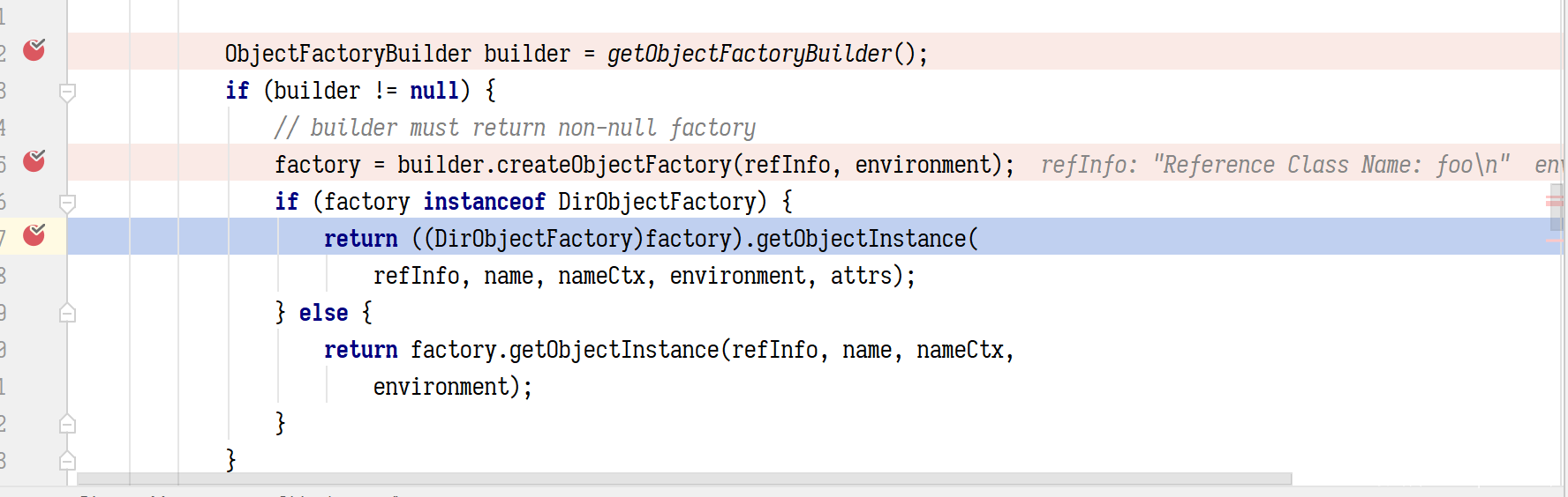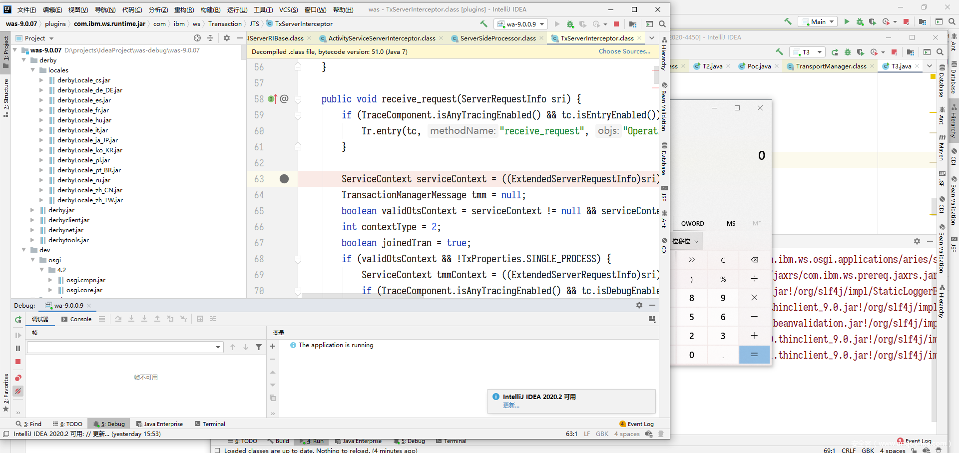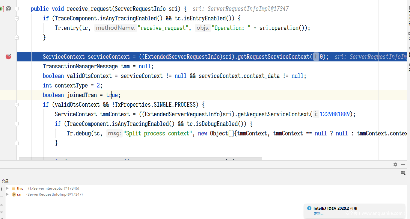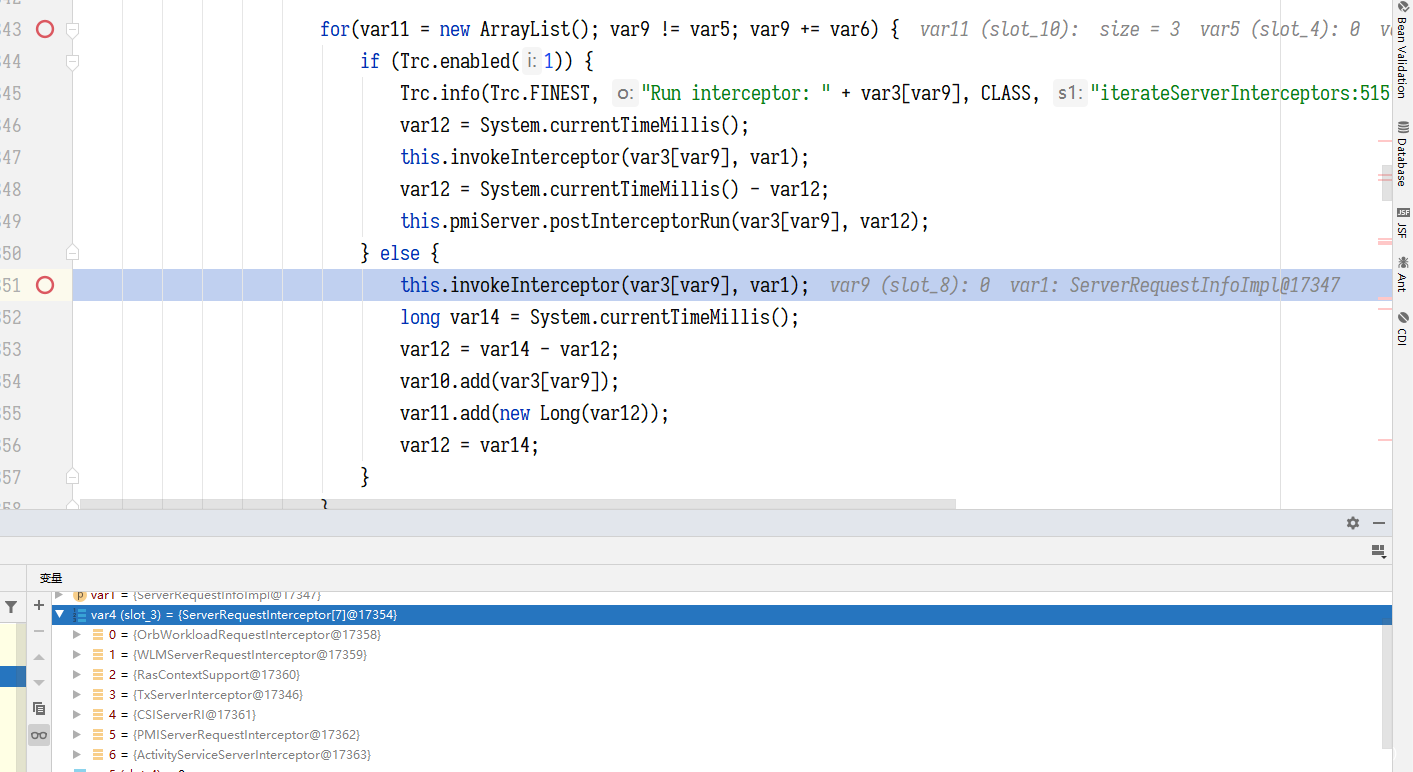 问题就出在这里,因为本质上,要进入到本次的反序列化调用点,根本是不需要一个 LocateRequst 的,我们可以 debug 看一下,在 WAS 的服务端在接受 iiop 请求时,会先经过几个拦截器的处理,默认情况下一共7 个拦截器