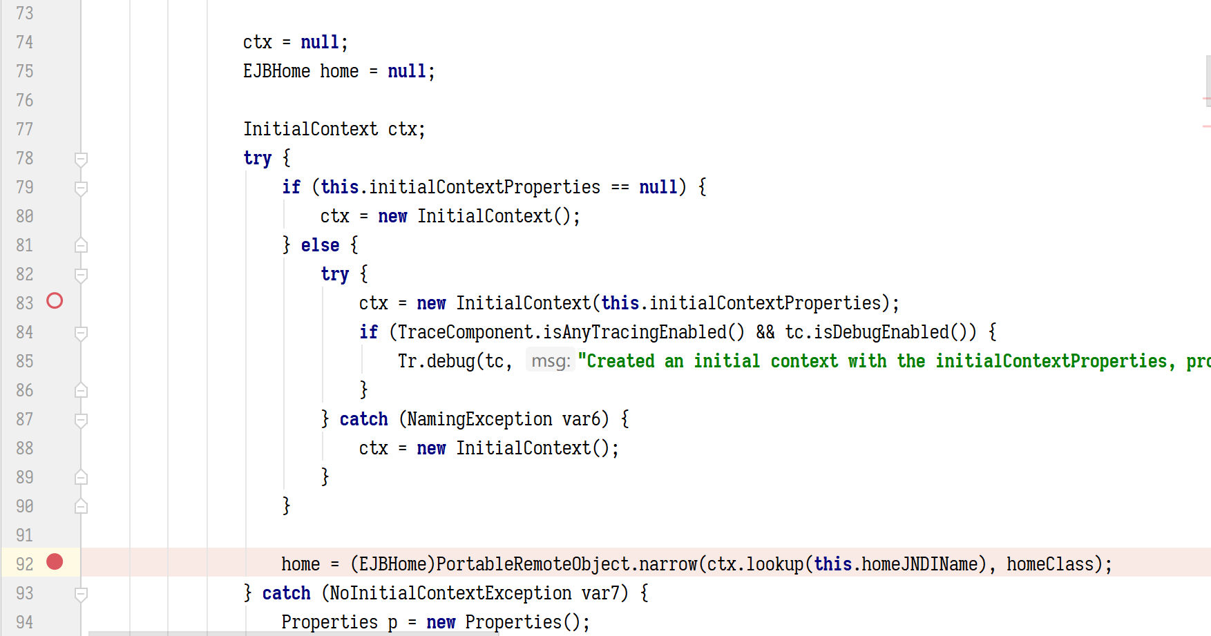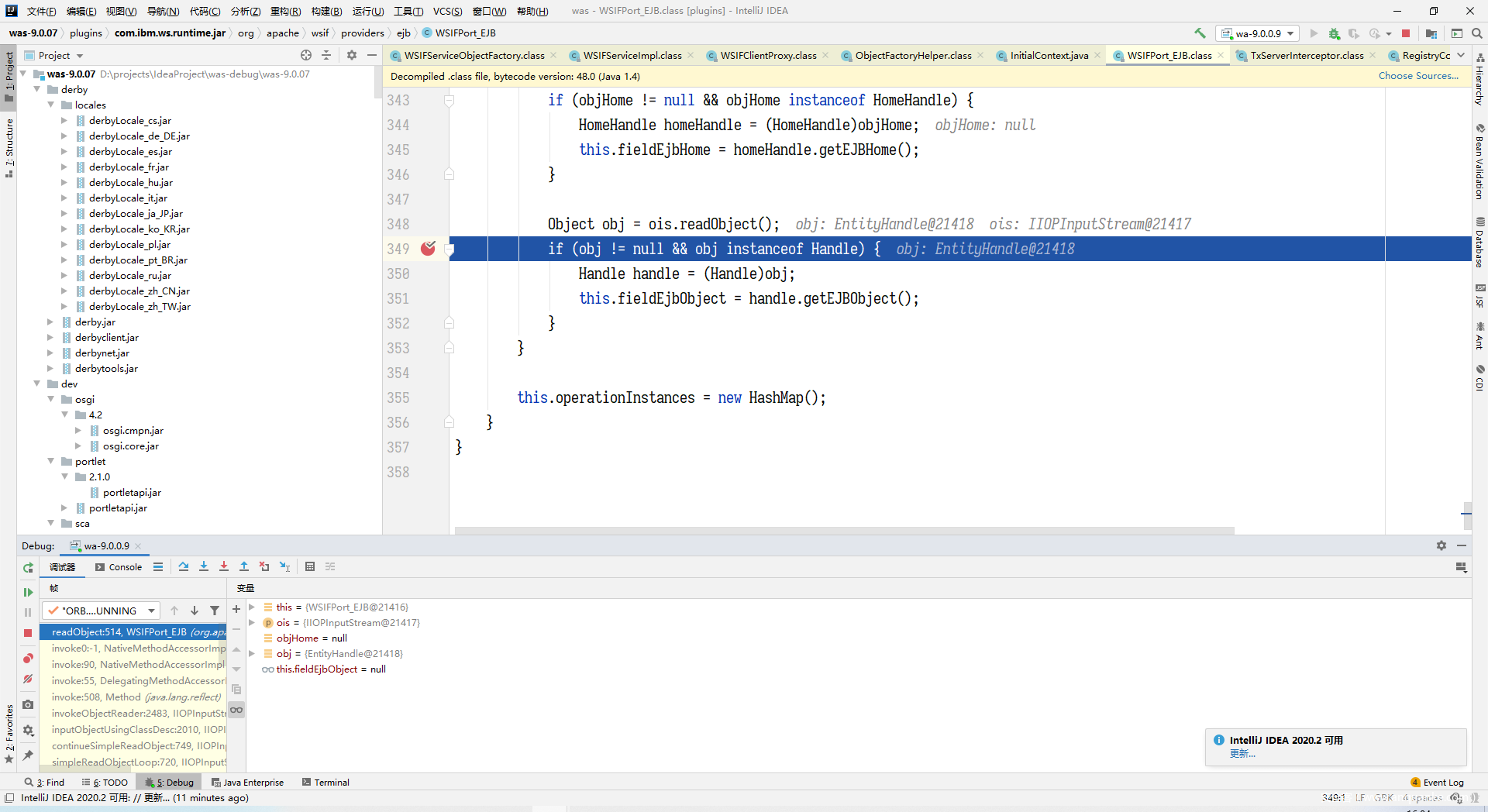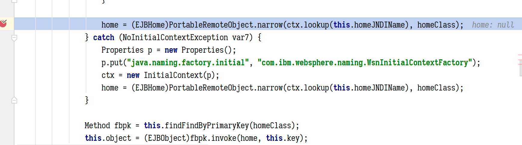 WAS 默认对 RMI/IIOP 开启了 SSLBasic 认证,前面为了聚焦漏洞我把 WASSSL 关了,如果没关,又没指定 SSL 配置文件的话,直接用互联网中公开的漏洞利用方案在设置 ServiceContext 时相关的代码会直接报错抛出异常。