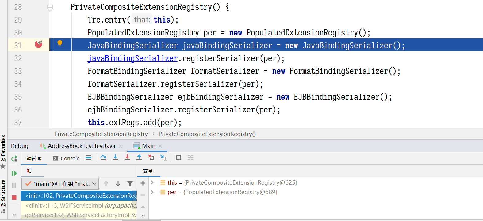 第二步实例化 WSIFService,会往扩展注册中心注册几个拓展元素的解析器,其中 JavaBindingSerializer 就是解析 WSDLjava 这个命名空间元素的: