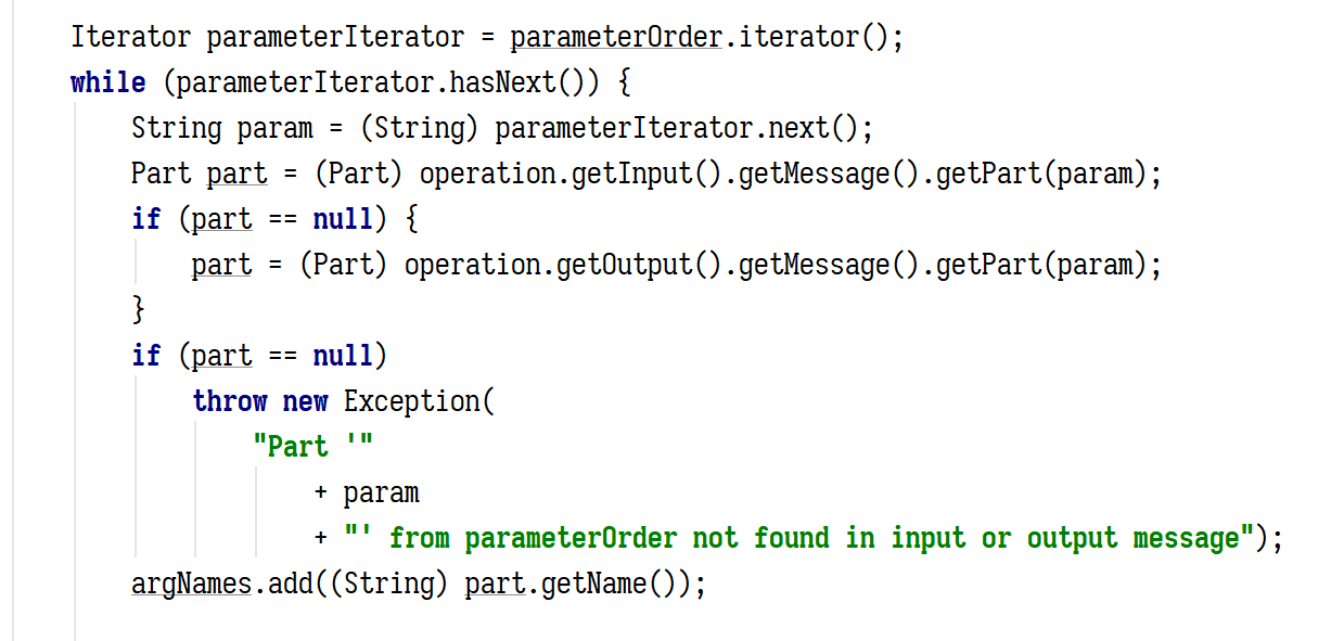 WSIF 会遍历这个列表中的名字,根据当前选定的 WSDL 中的 operation 找到对应的 message 元素,然后会根据这个 parameterOrder 列表中的名字匹配其中的 part 元素的名字,也就是参数名,实例化这个元素指定的 typeClass 对象,放到返回值列表中,在一次遍历的过程中,先是找到 input,匹配不上再找output,如果都匹配不上就报错,到这里我们看到了第三个限制,就是指定了 parameterOrder ,那么对于与其相匹配的 operation 中的 message 中定义的参数名一定要和 parameterOrder 中的一致,至于 returnPart 这个属性有无都行