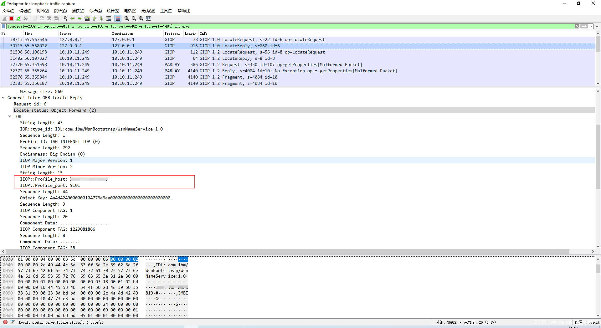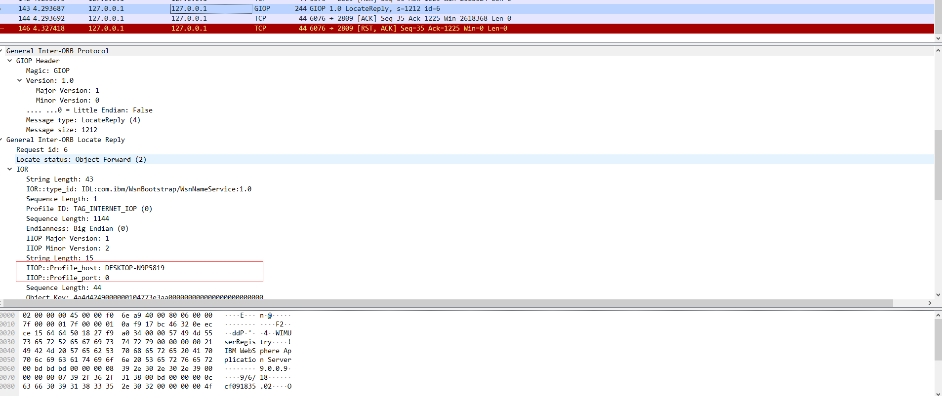 所以想写个实战能用的 POC 或者 EXP 的话,直接用 WAS 的 JNDI API 肯定不行的,可以再找一下可以直接发 Request 和设置 ServiceContextAPI 。或者考虑手动构造一下数据包,默认端口没改的情况下,直接打2809或者9100,至于怎么构造,可以参考一下 GIOP规范JDK 或者 IBM 的那套 corba api ,下面演示一下大致的构造过程