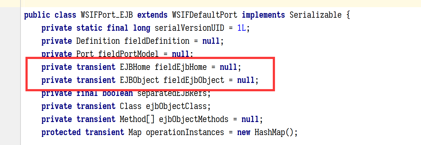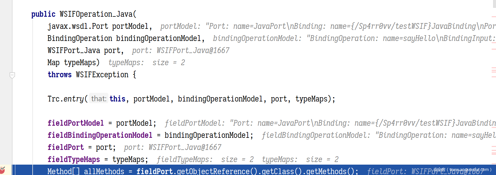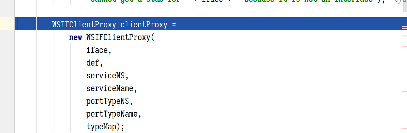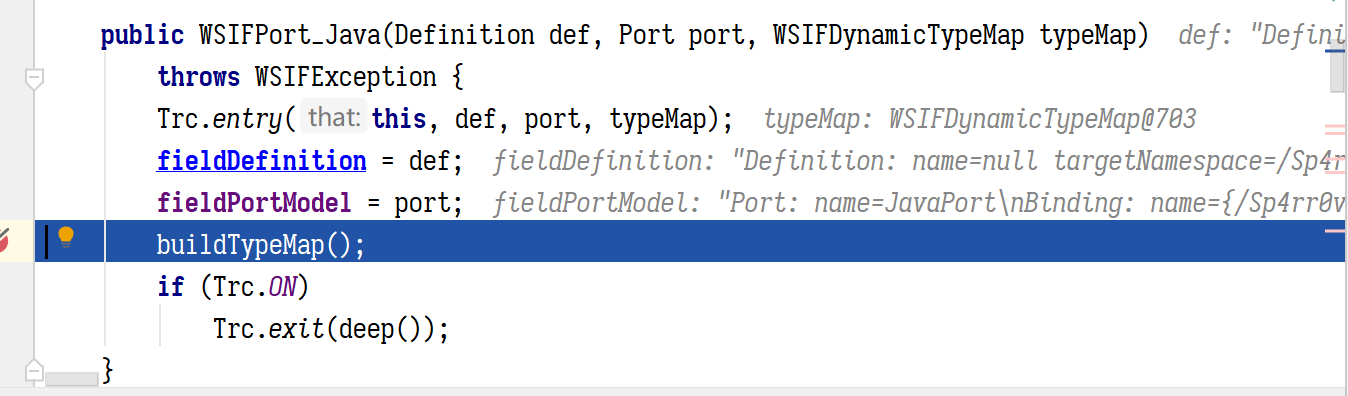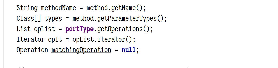 这里我们 WSIFPortWSIFPort_Java,所以最终的实现类是 WSIFOperation_Java ,但是在这之前还会有个判断,就是会根据我们选的 port,找到 bingding,在遍历 binding 里的operation 元素,必须要有一个 operation 的名字和正在调用的方法名一致,不然就会直接返回,到这里我们看到都是对 wsdloperation 名以及参数类型的限制而已,下面是 WSIFPort_Java 这个类的实例化