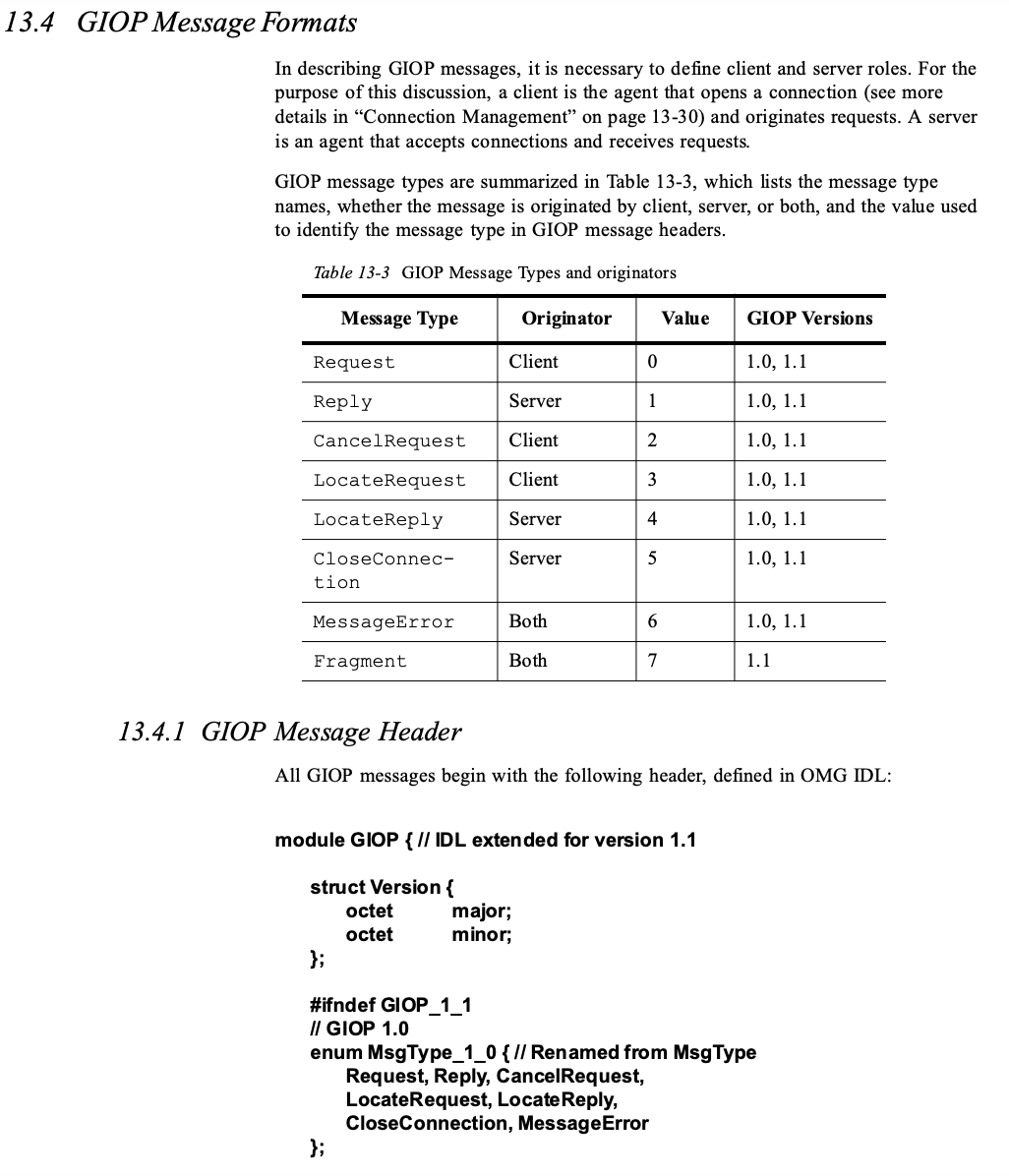 参照 GIOP 规范,整个 GIOP 头是固定的 12 个字节,其中第 8 个字节是请求类型