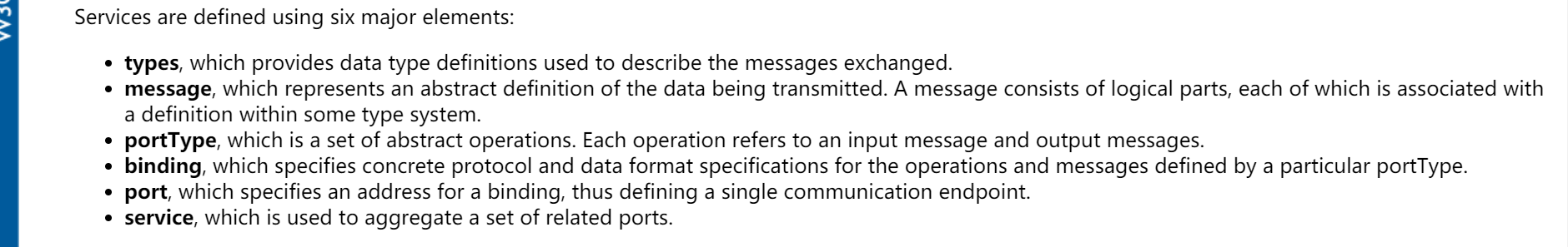 一个 WSDL 文档通常包含 8 个重要的元素,即 definitions、types、import、message、portType、operation、binding、service 元素,其中 service 元素就定义了各种服务端点,阅读wsdl时可以从这个元素开始往上读。