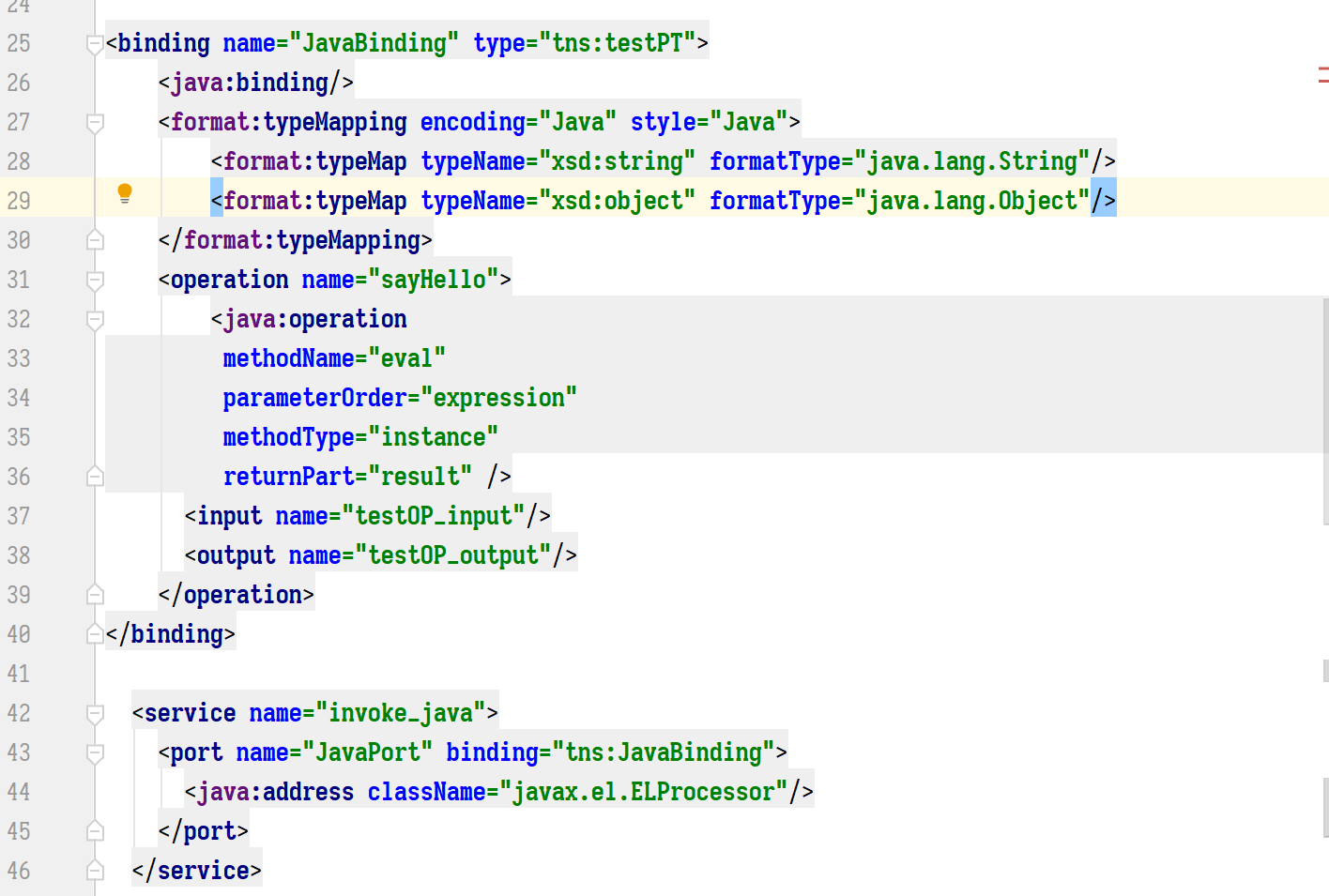 其中 java 命名空间元素是关键要素,其中包含了实际执行方法的类和方法,后面我们将会看到 WSIF 如何将 Hello#asyHell(Sring name); 接口方法调用变成 ELProcessor#eval(String)