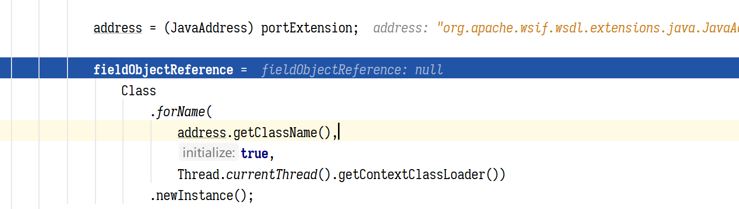 这个类有个叫 fieldObjectReference 的字段很关键,后面我们会看到它就是我们在 WSDL<java:address > 这个元素中指定的ClassName的实例对象,也是最终执行方法的对象。