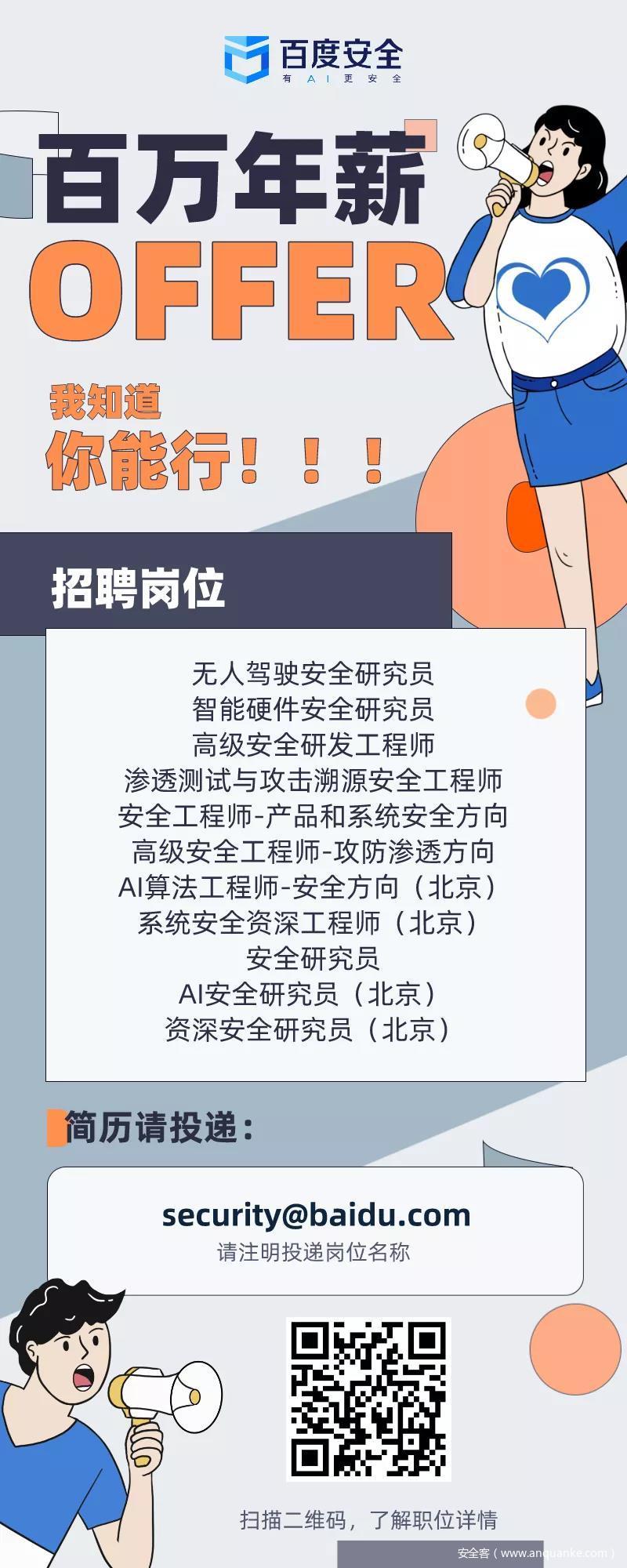简历请投递至:security@baidu.com(请注明来自安全客)