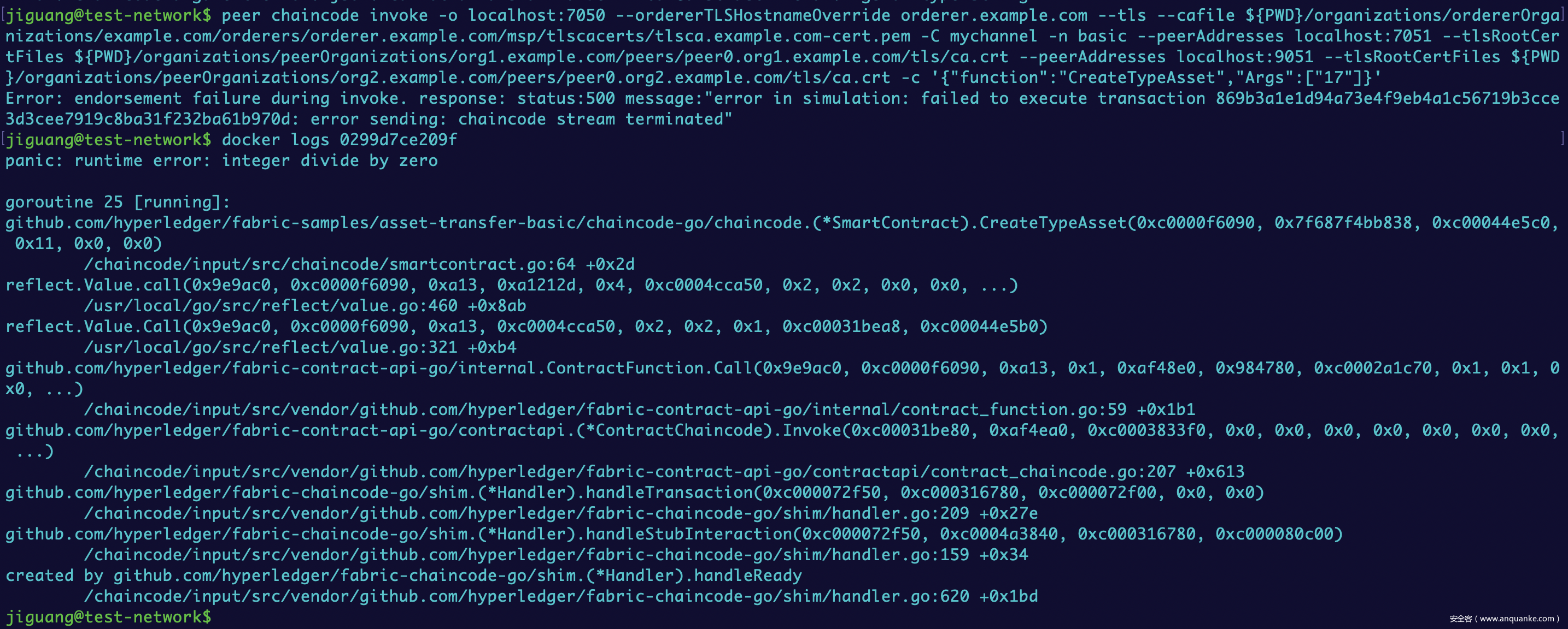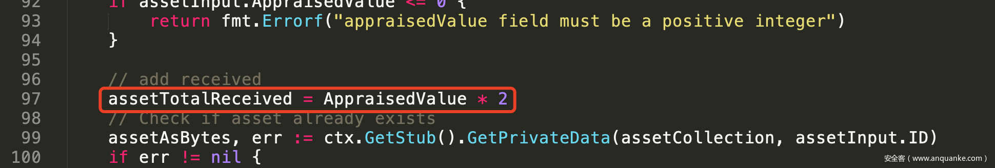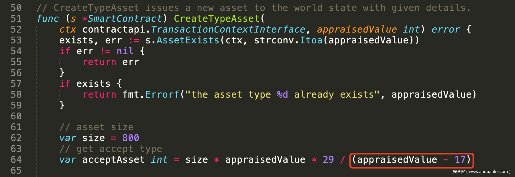 在CreateTypeAsset函数的第64行,通过传入参数appraisedValue来计算接收资产类型值,实际上,当传入参数appraisedValue等于17时,将发生除零风险问题。