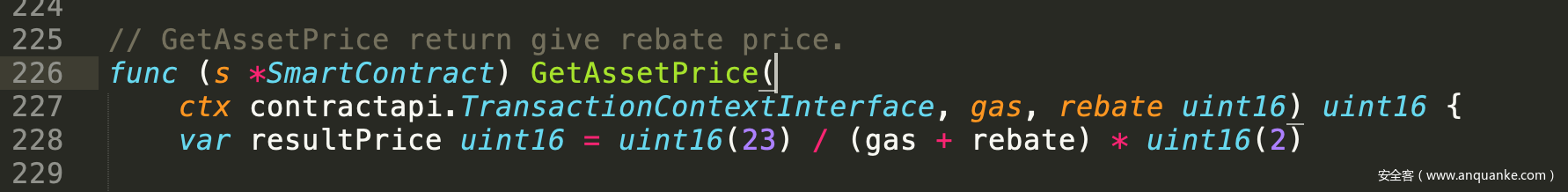 智能合约中GetAssetPrice函数用于返回当前计算的差价,第228可知,gas + rebate可能发生溢出,uint16表示的最大整数为65535,即大于这个数将发生无符号回绕问题: