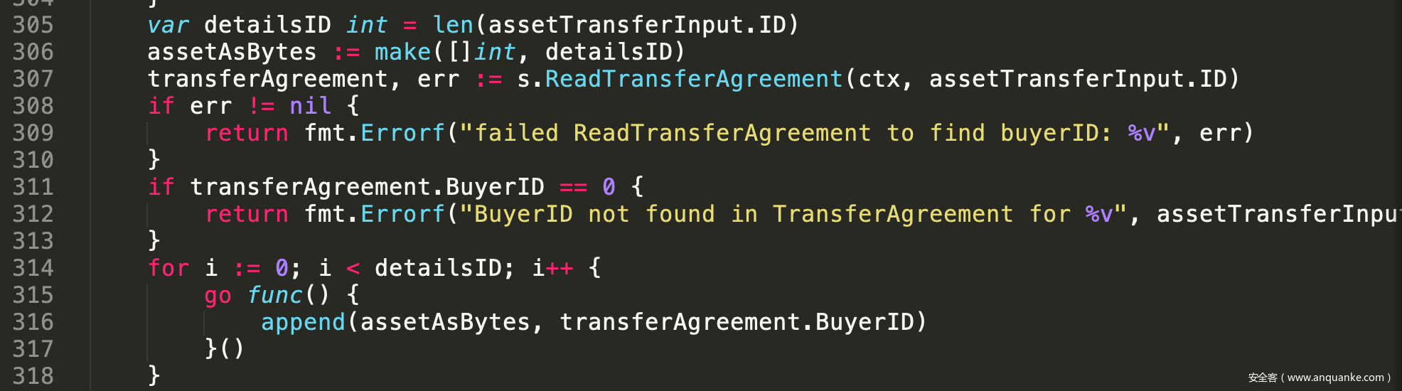 如上代码,assetTransferInput.ID为用户可控参数,如果传入该参数的值过大,则make内存分配可能导致内存溢出。