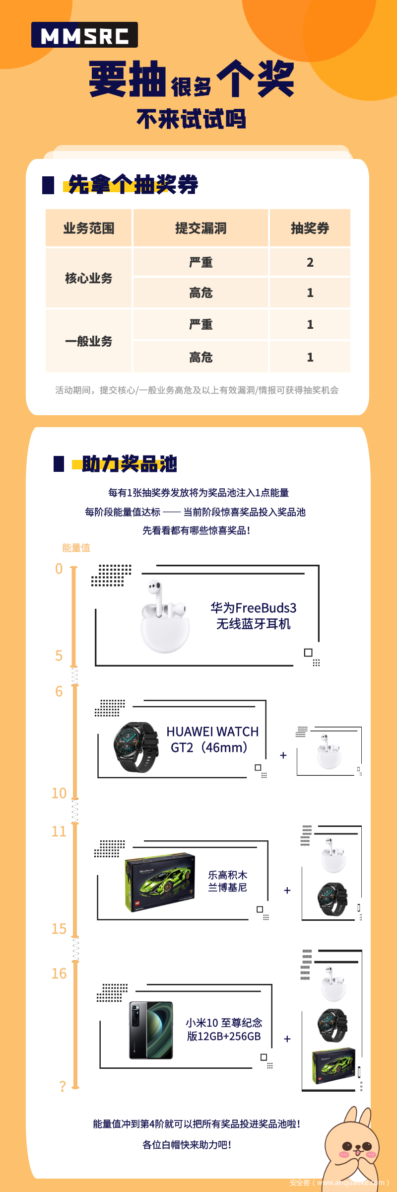 每有一枚核心/一般业务的高危及以上有效漏洞/情报提交,将为奖品池助力一次