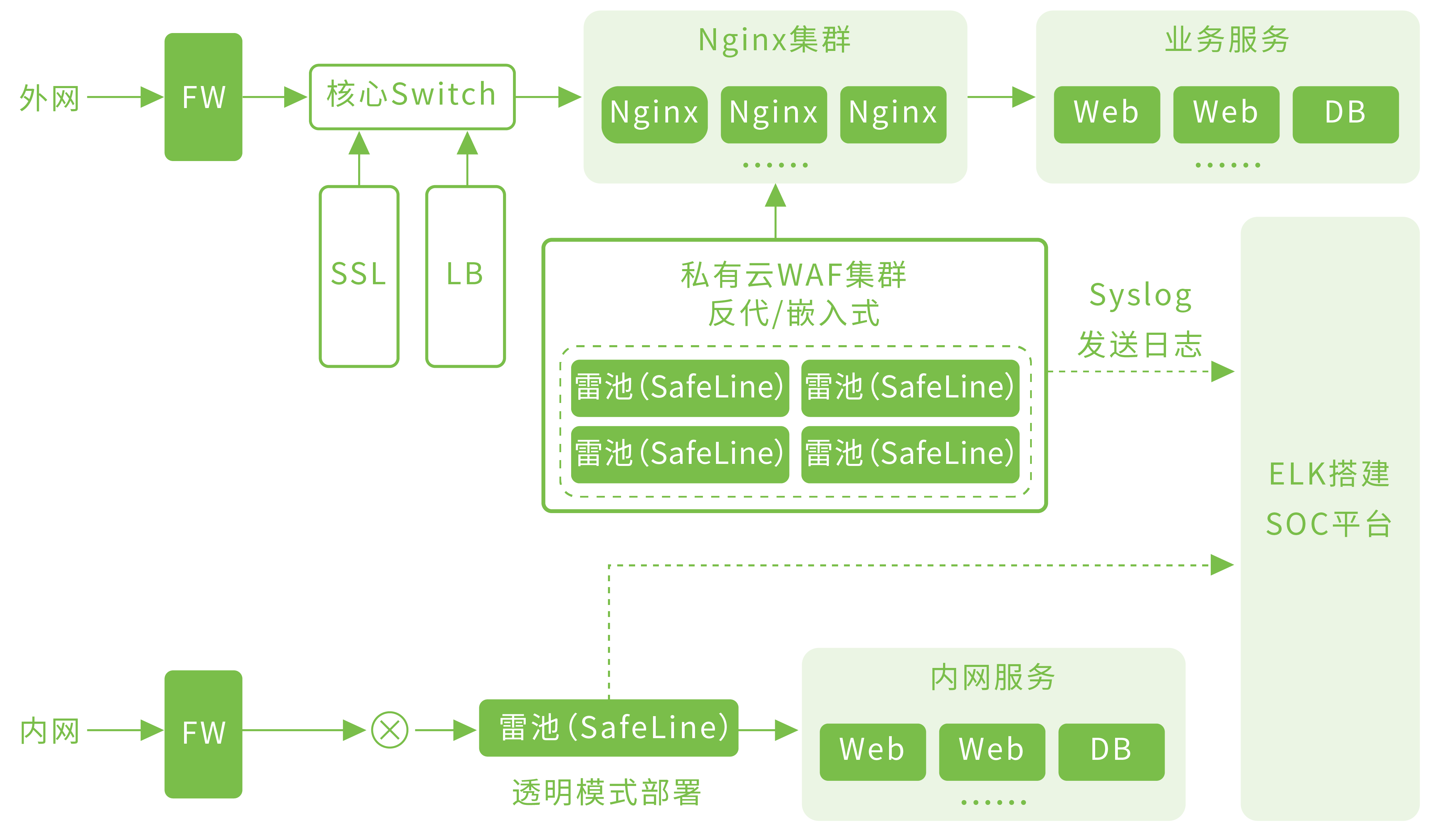 该银行网络架构复杂,不同机房要求的部署方式迥异。雷池(SafeLine)拥有灵活的容器化系统架构,具备弹性、灵活的优势,可以满足不同场景下的部署需求,本次方案在不同机房采用三种部署方式, 雷池(SafeLine)为其提供集群嵌入式+单机嵌入式+透明桥的综合部署模式,满足该 行不同部署场景的差异化需求。