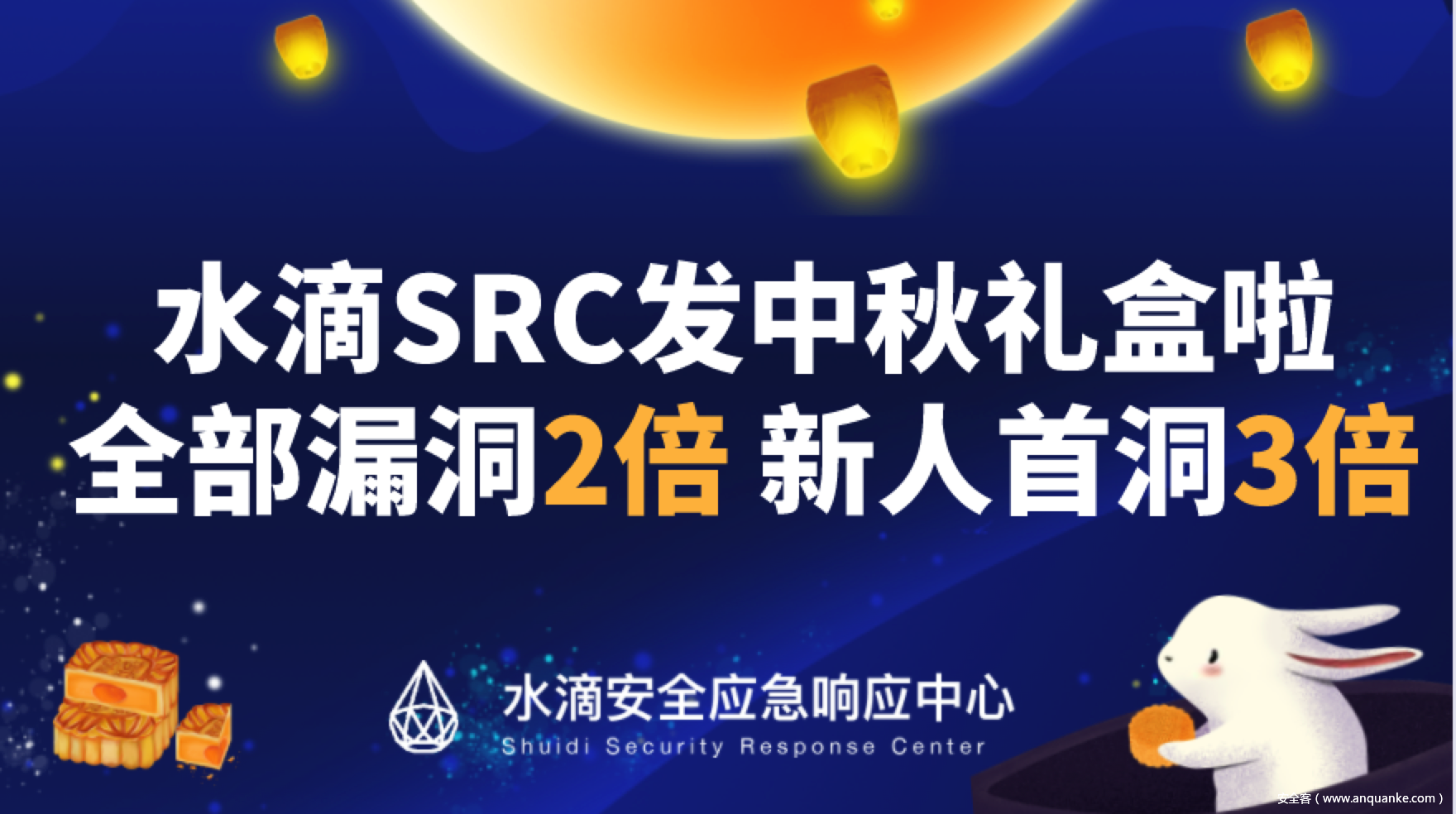 双节来临之际,水滴SRC给大家带来了一波多重福利活动!中秋礼盒、挖洞双倍、新人首洞三倍、限时兑换周边福袋等多重福利已就位,叫上好友一起来挖洞吧!src官网地址:https://security.shuidihuzhu.com