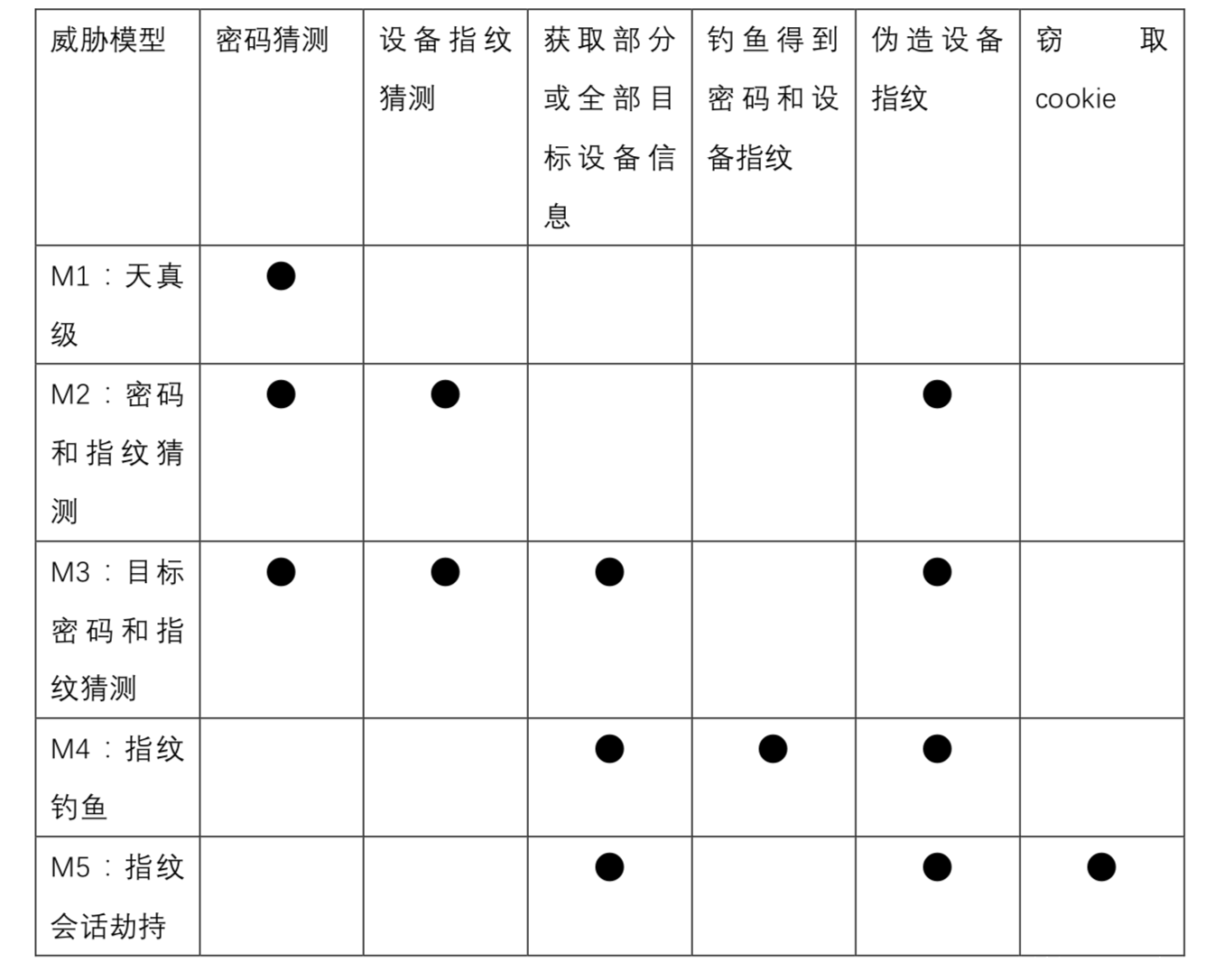 M5:利用指纹欺骗进行会话劫持。攻击者目的是劫持会话,M1-M4攻击者是通过密码和指纹伪造来破解账户。M5攻击者则可窃取会话cookie,并利用诸如配置不当的HTTPS或XSS漏洞来执行用户端JavaScript。这样攻击者能够捕获设备指纹,从攻击者设备上恢复会话。因此,在M5下设备指纹必须很难伪造。