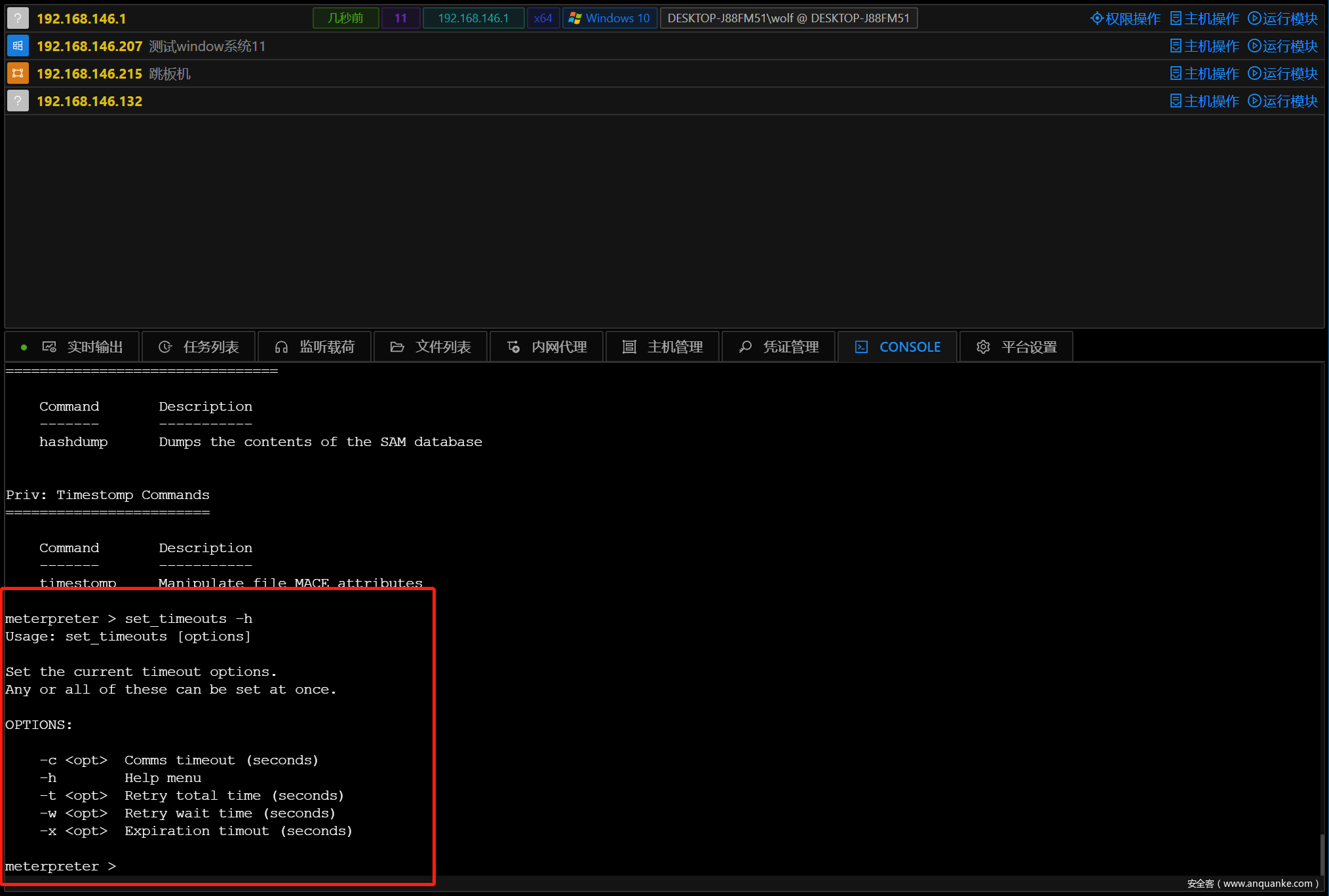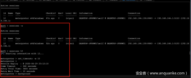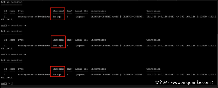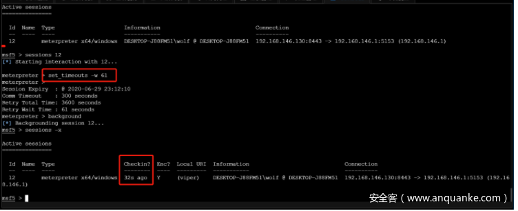 - 在checkin大于55时执行set_timeout -w 10,可以恢复原有通讯间隔.(因为meterpreter命令默认超时时间为10秒,所以要在checkin大于50的时候操作)