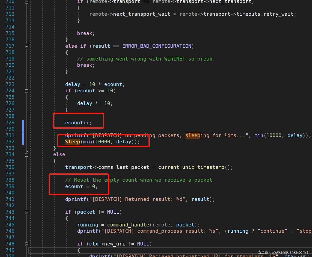 如果要模拟Cobalt Strike效果,其实只要修改Sleep(min(10000, delay))中的delay就可以了,那我们怎么实现动态控制呢?为了尽量少改动代码,我们先借用已有的功能来帮助我们实现.