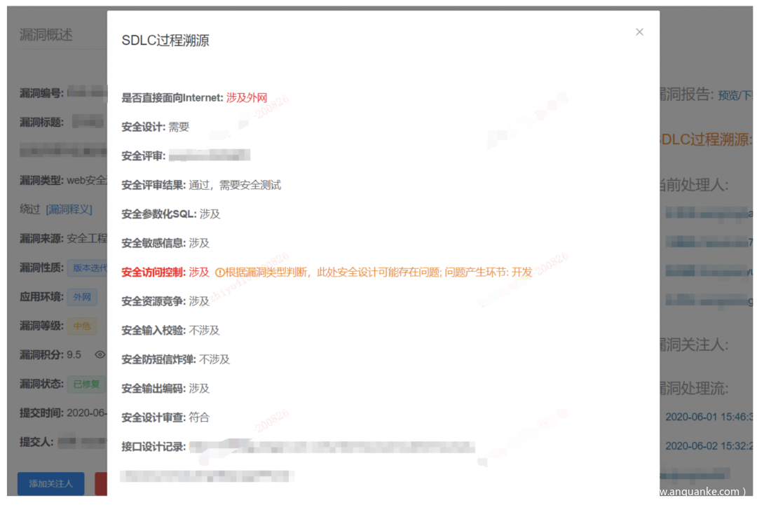 这几个环节下来,如果由开发完全独自执行,对于安全意识不够强的研发同事来说,安全设计的质量无法保证,这个时候基本上是安全团队在测试过程中对发现的安全漏洞进行溯源,定位安全设计及审查环节的问题,做常态化的检查。
